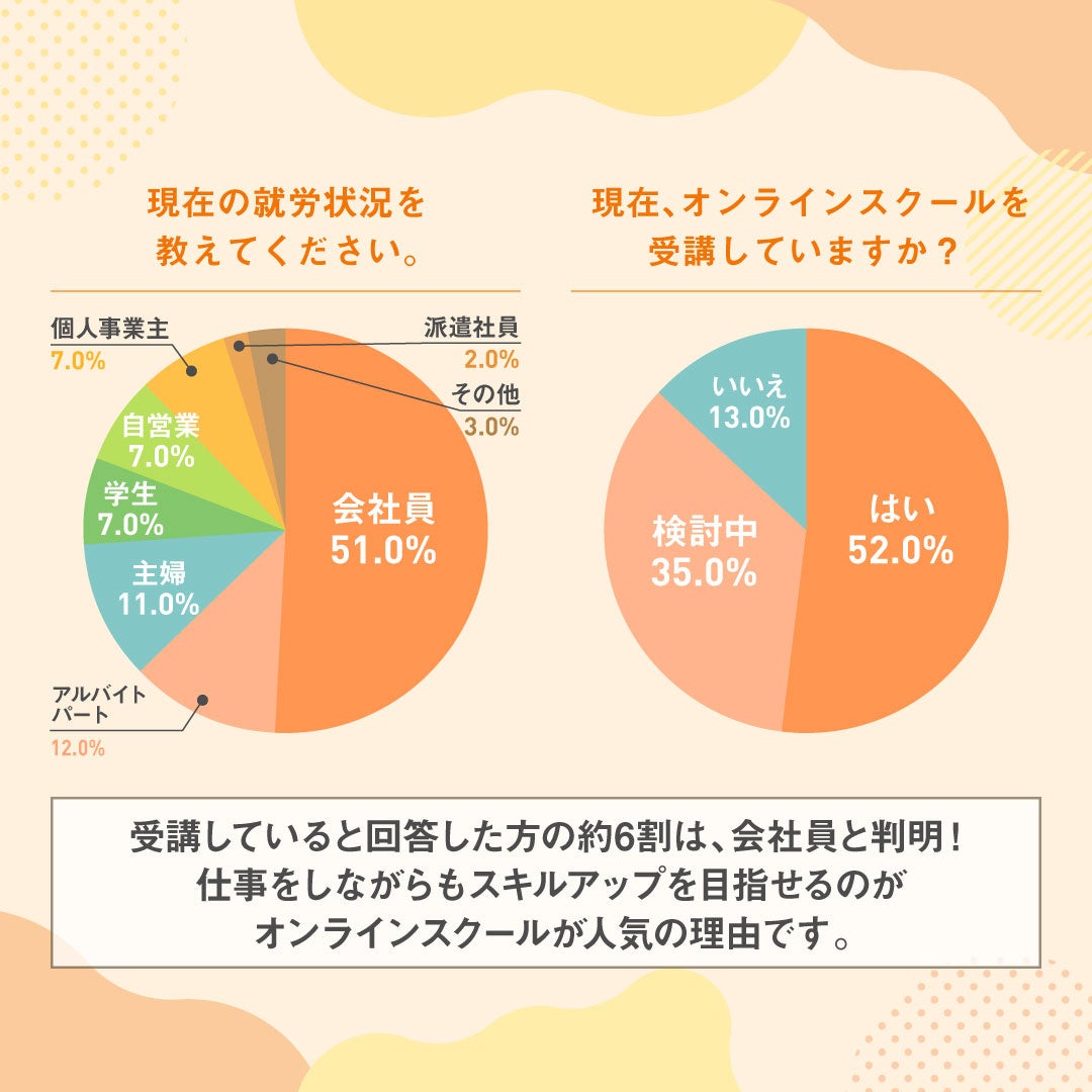 今回オンラインスクールに関する意識調査を行ったところ、約半数がオンラインスクールを受講中であることが分かりました。そして、職業については約半数以上が会社員であり、スキルアップや収入アップ、新しいことにチャレンジしたい、と考えている方が多かったです。