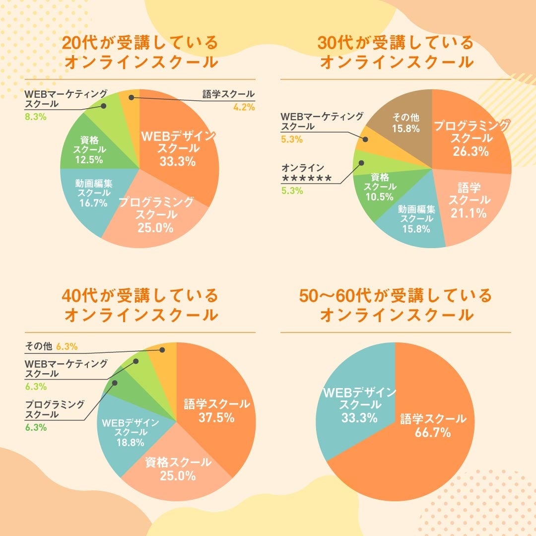 年代が若くなってくるにつれて、語学スクール・資格スクールよりもプログラミングスクールやWEBデザインスクール、動画編集スクールに注目が集まっています。