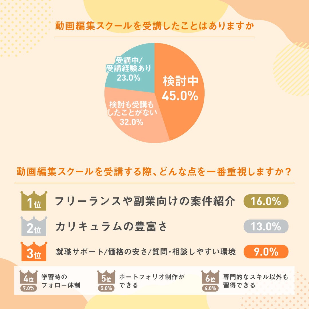 特に今回の回答ではオンラインスクールの中でも、動画編集スクールが注目度の高いスクールであることがわかりました。動画編集は、未経験者でも始めやすく、企業や個人問わず動画編集者の需要が高まっている職種であることから、収入の安定性も高く、これからも人気が増加するジャンルでもあるでしょう。