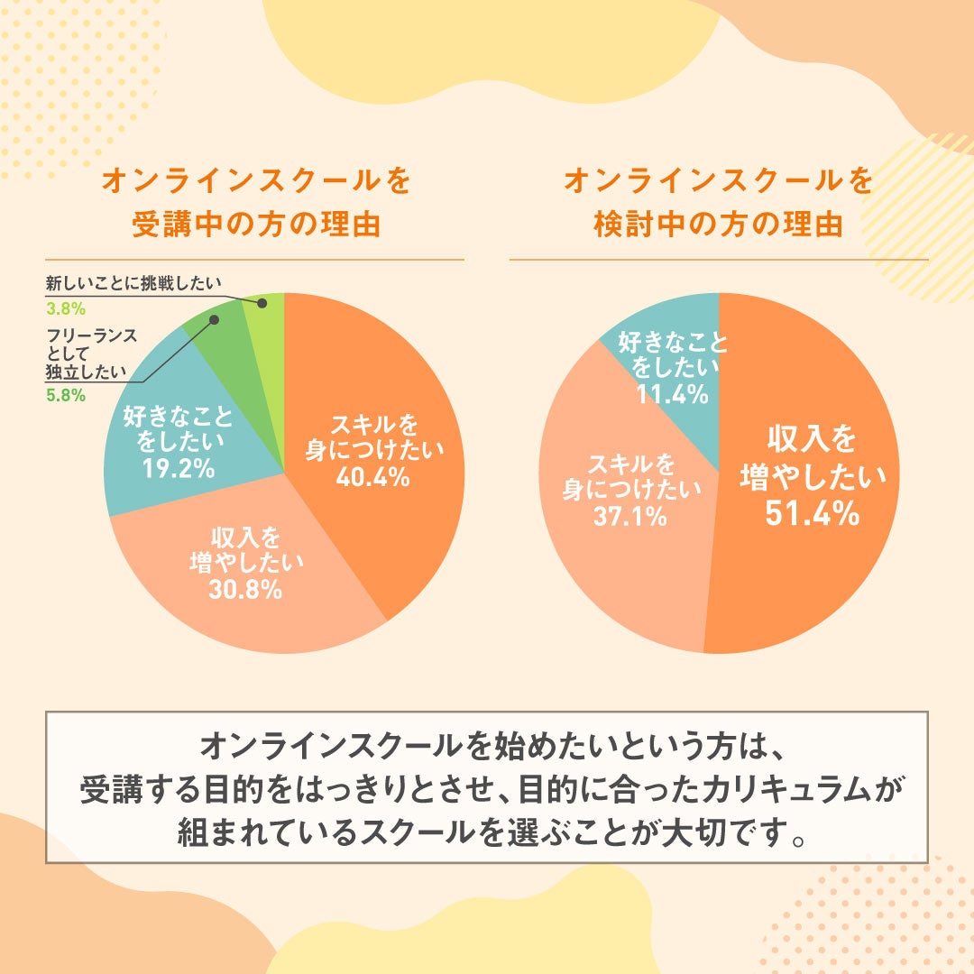 現在オンラインスクールを受講中の方の理由として多かったのは、スキルを身に付けたいからという結果になりました。