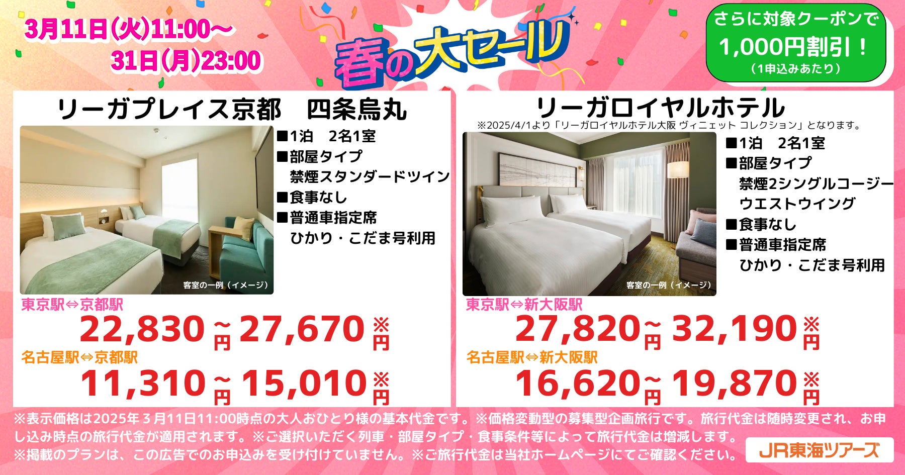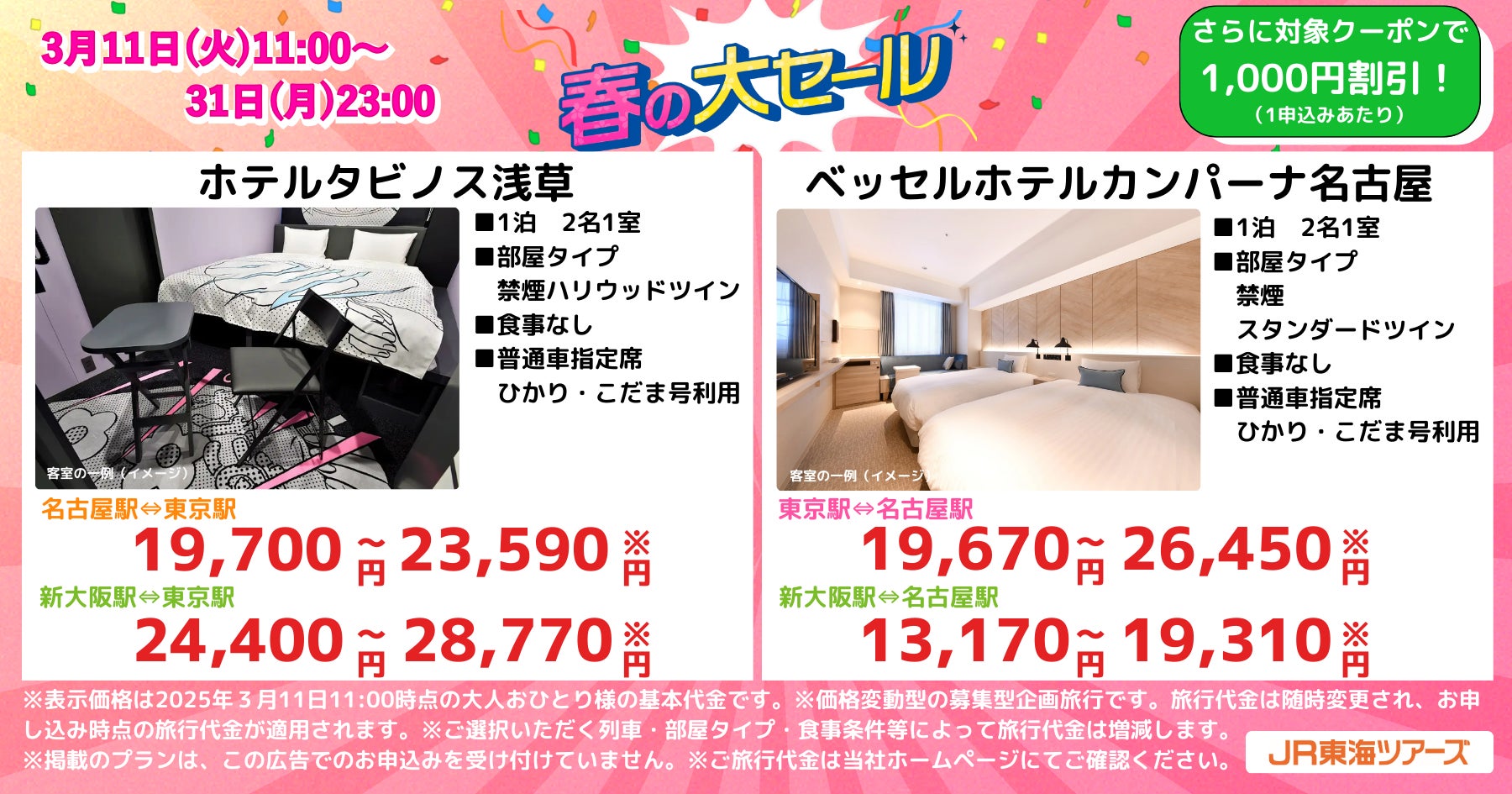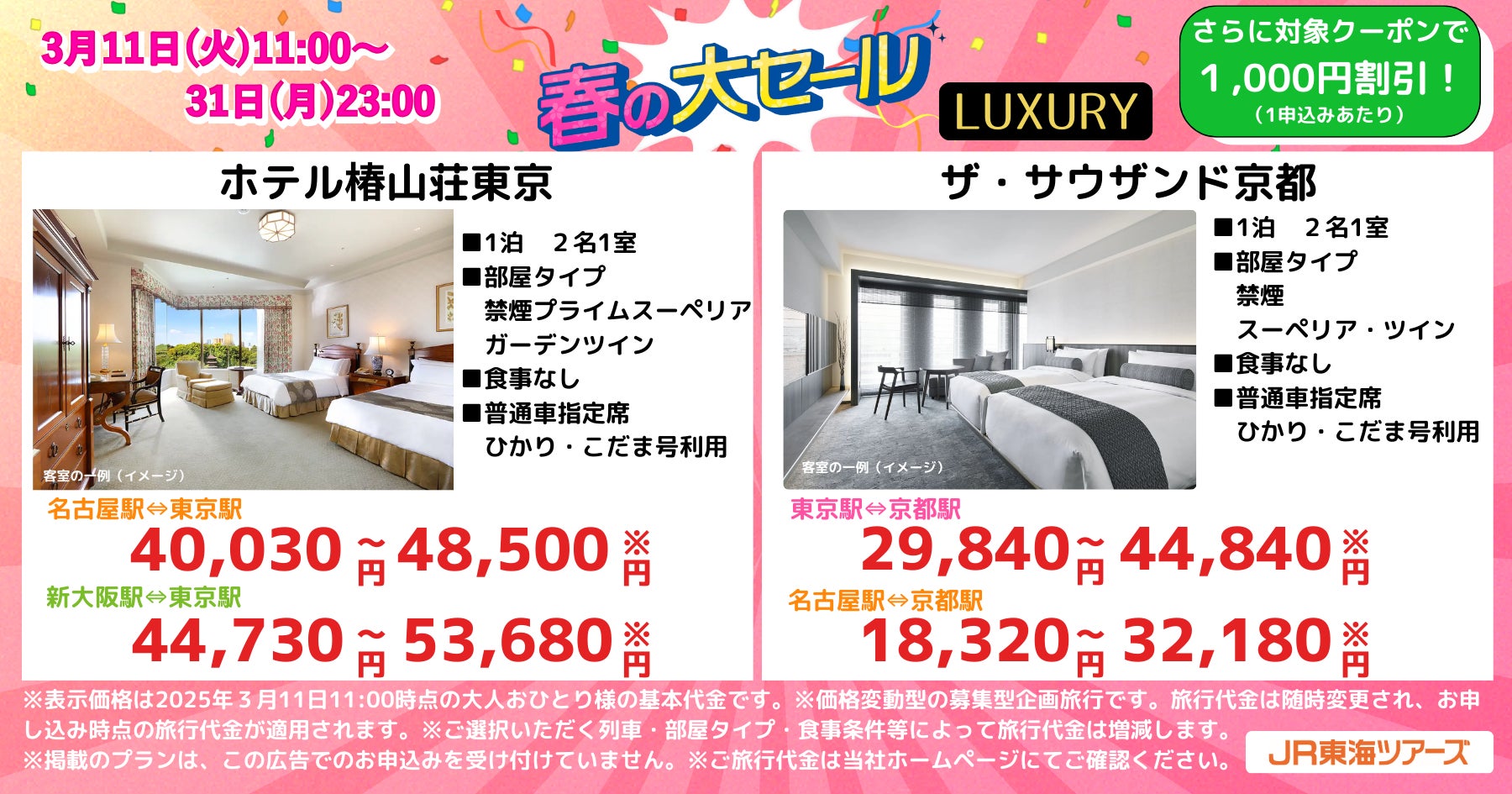 株式会社ジェイアール東海ツアーズ(本社:東京都中央区、以下JR東海ツアーズ)は、2025年3月11日(火)11時から3月31日(月)23時までEX旅パック「春の大セール」を開催します。今回のセールは、2025年5月7日(水)出発から2025年7月18日(金)帰着の旅行が対象です。往復新幹線と誰もが一度は泊まってみたいラグジュアリーホテルやコスパ重視ホテルの選べるホテルがセットになったEX旅パックを、期間限定のセール価格で予約ができるチャンス!さらに、EX会員情報にLINEアカウントを連携すると、セール価格からさらに最大3,000円割引となるキャンペーンも実施します。この機会をお見逃しなく!