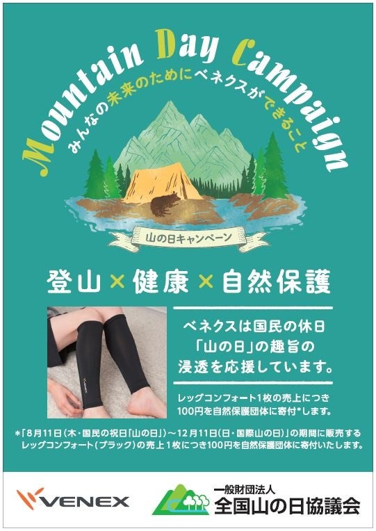休養時専用の「リカバリーウェア」を開発、製造、販売する株式会社ベネクス(所在地:神奈川県厚木市、代表取締役:中村 太一、以下、当社)は、登山後のケアに役立つアイテムとして、ふくらはぎをピンポイントでケアする『レッグコンフォート』を、山の日である2022年8月11日(木・祝)より特別パッケージを施して、全国の取扱い店舗および公式オンラインストアにて販売を開始します。また、販売開始から国際山の日である12月11日(日)までの売上の一部を自然保護団体へ寄付します。尚、当社は一般財団法人全国山の日協議会(所在地:東京都新宿区、以下、全国山の日協議会)の団体賛助会員であり、国民の祝日「山の日」浸透に賛同しています。