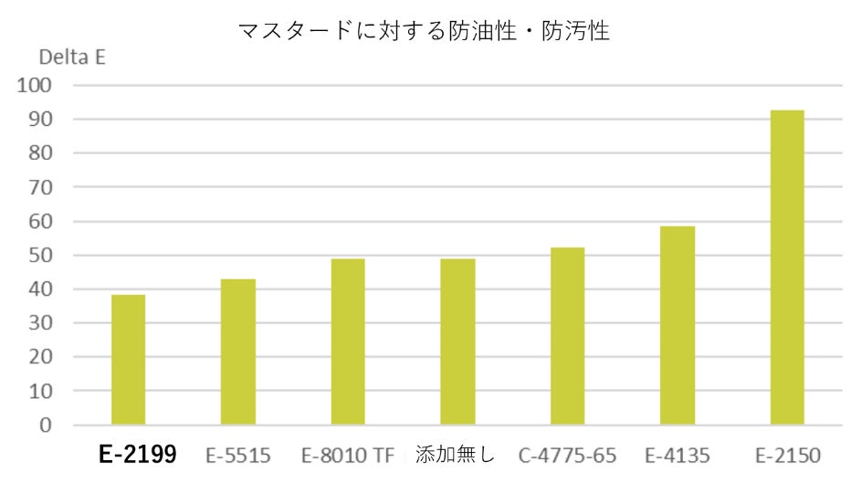 図2では、油汚れ(マスタード)に対する防汚性・防油性を示しており、本製品を使用すると汚れが付着しづらいことが実証されています。