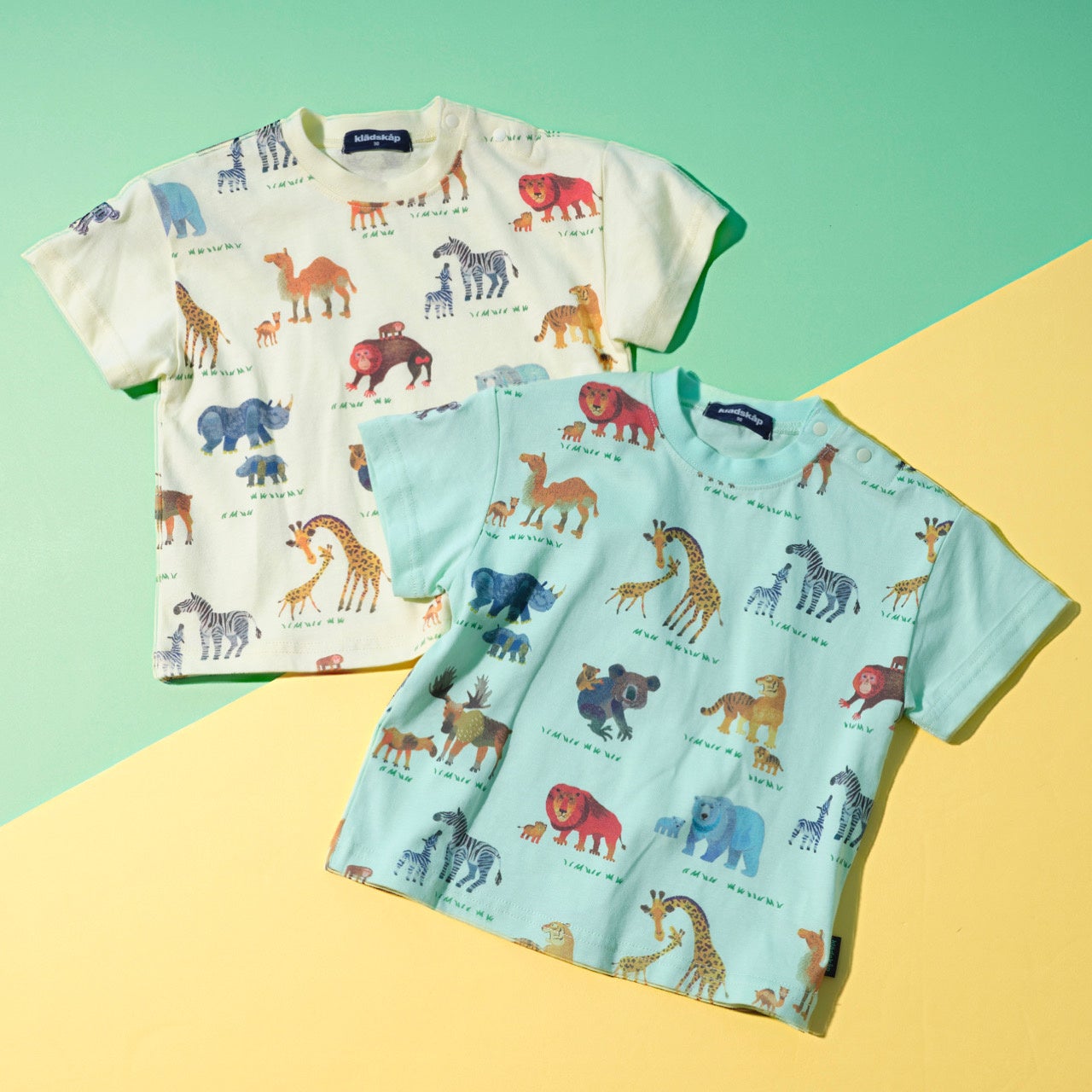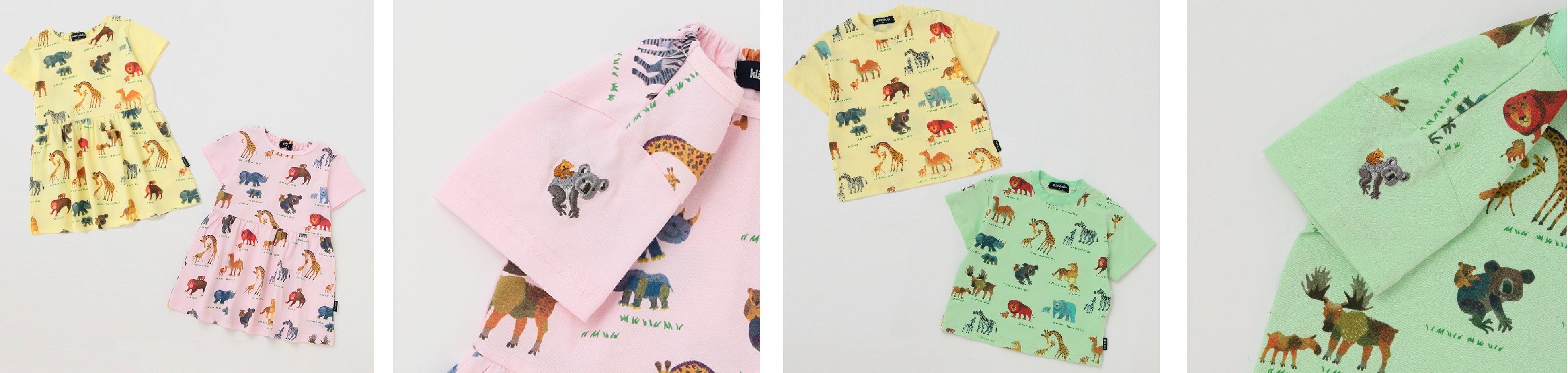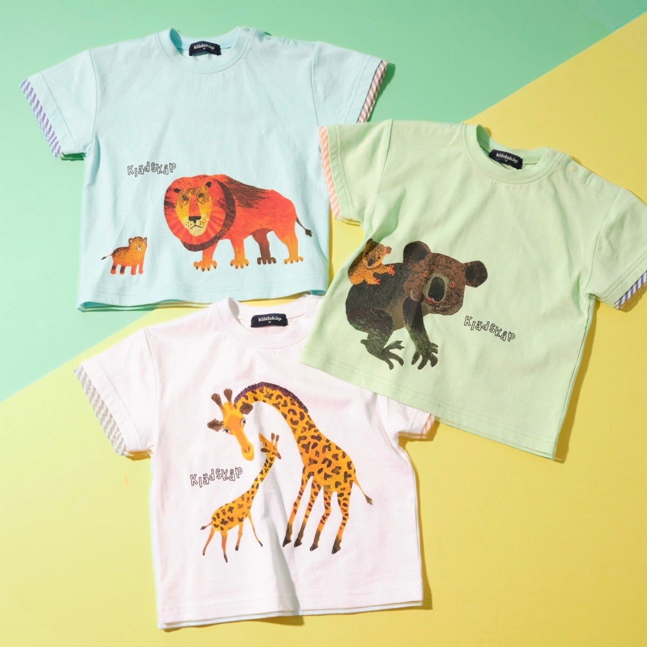 ライオン・キリン・コアラなどの動物のイラストを大きくプリントしたTシャツや、