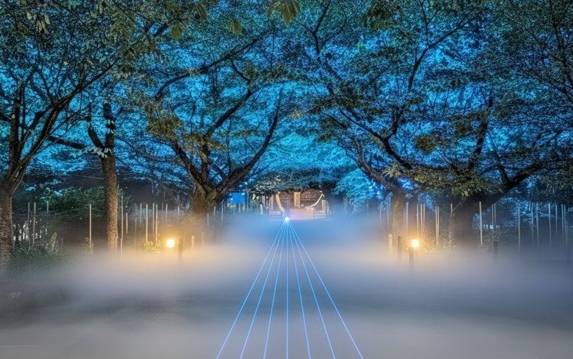 ライトアップされた紅葉に囲まれた方丈庭園(名勝史跡)に、巨大な雲海が現れ、風の動きが美しく表現されます。鈴虫の音色とニューロミュージックのアンサンブルが、秋の静寂と調和を感じる特別な体験をお届けします。