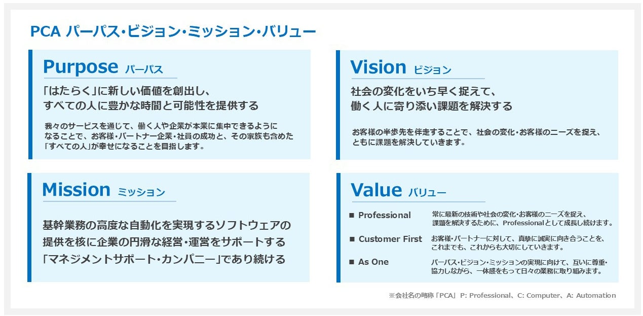 『PCA AI アシスタント(仮)』の構想は、弊社が掲げる「パーパス・ビジョン・ミッション・バリュー」に直結します。