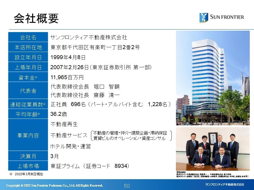 サンフロンティア不動産株式会社(本社:東京都千代田区、代表取締役社長:齋藤清一、東証プライム:8934)は、2022年3月期決算を発表いたしました。
