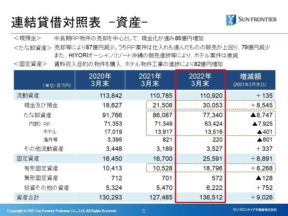 中長期RP物件の売却を中心として、現金化が進み85億円増加