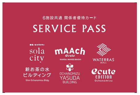 ※「サービスパス」:ワテラス、御茶ノ水ソラシティ、マーチエキュート神田万世橋、新お茶の水ビルディング、御茶ノ水安田ビル、エキュートエディション御茶ノ水の6施設共通関係者優待カードです。「SERVICE PASS」カードをご提示いただくことで対象店舗にて関係者優待サービスを受けられます。