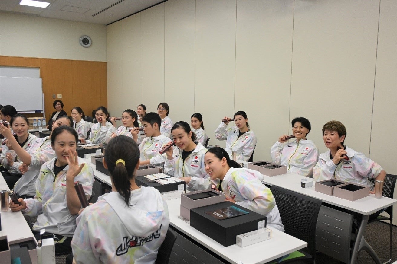 マーメイドジャパンの皆様へ「目もと専用美顔器『The Horuseye』(ザ・ホルスアイ)」を贈呈させて頂き、アーティスティックスイミングにとって競技結果をも左右する、「表情筋のトレーニングおよび肌ケア」を当社の美顔器を通じてサポート致します。さらに効果的な使用法をお伝えするため、6月12日に国立スポーツ科学センターにて代表選手の皆様へ「美顔器講習会」も実施させて頂きました。
