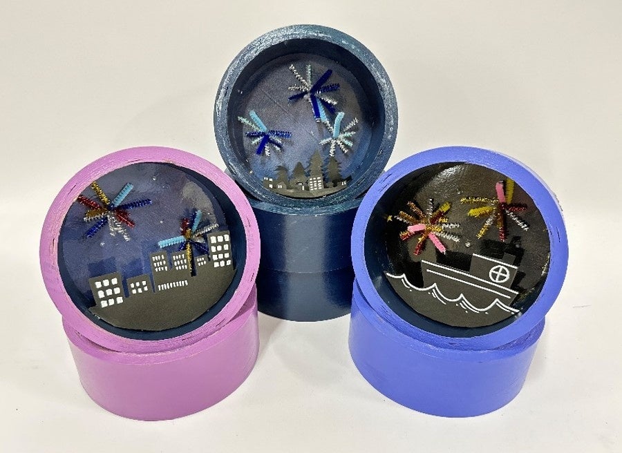 ●アート作品は、きっぷの芯の内側を夏の夜空に見立て、モールなどで作った花火に見立てた素材をマグネットで動かして、自分だけの花火を打ち上げます。夜空の下に広がる街並みは、子どもたちの自由な発想で創作いただけます。子どもたちが、自分の住む街や未来の街並みを想像することで、地域社会を大切にし、持続可能な未来を築く意識を育む機会を提供します。
