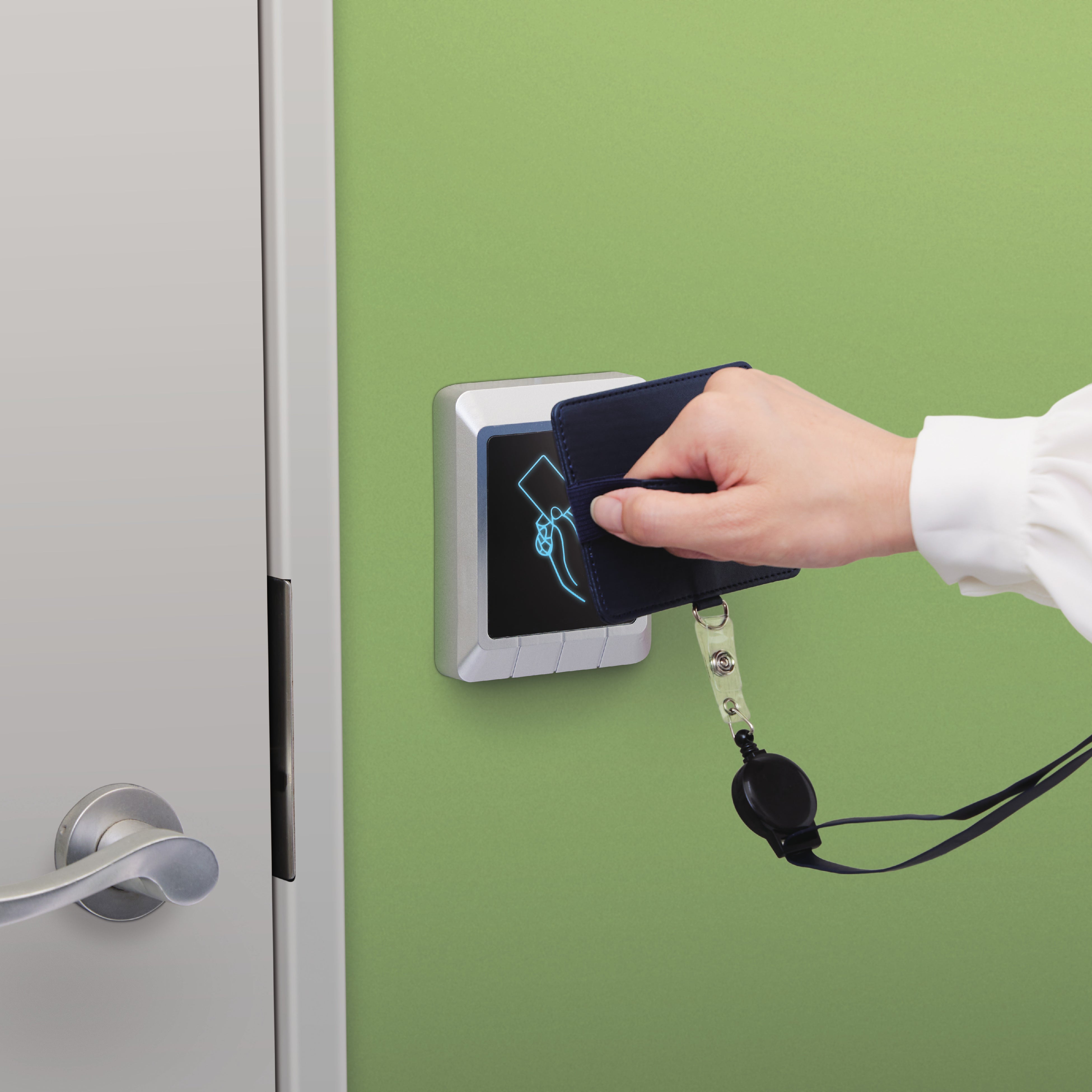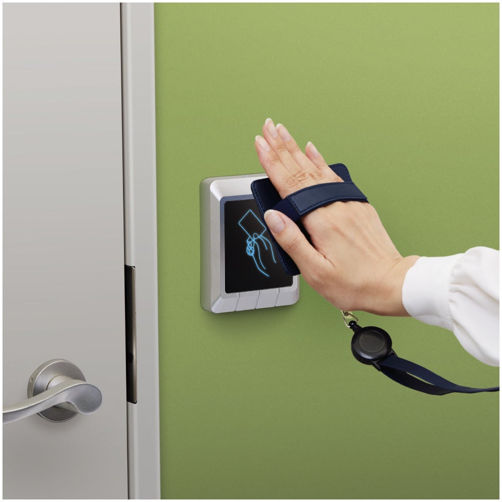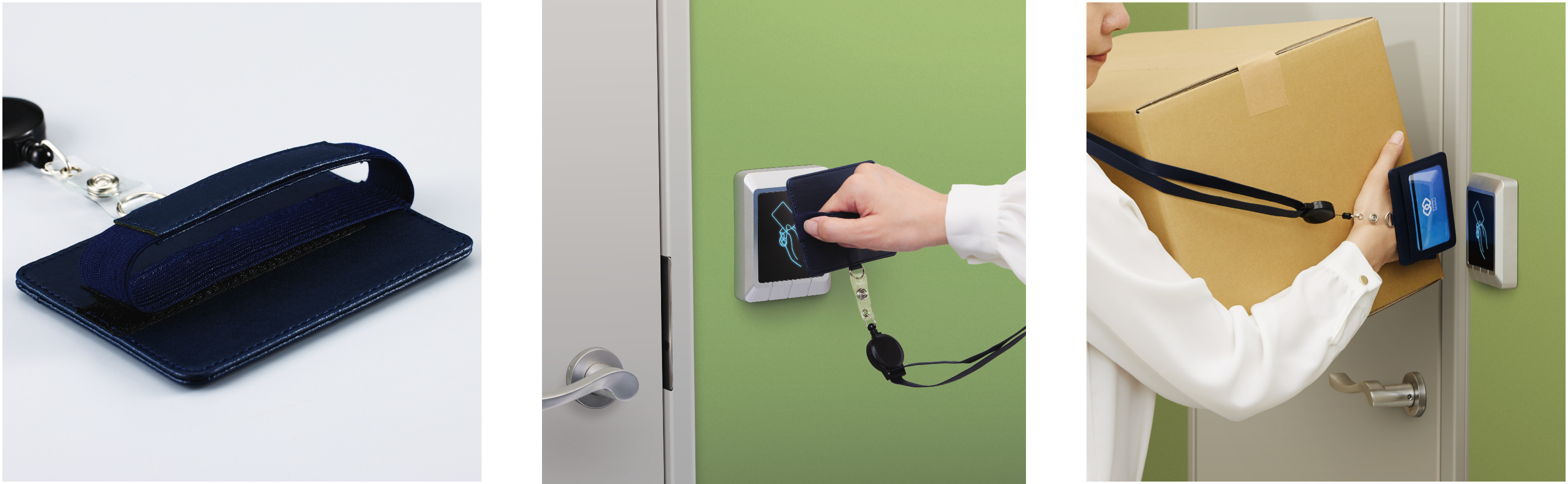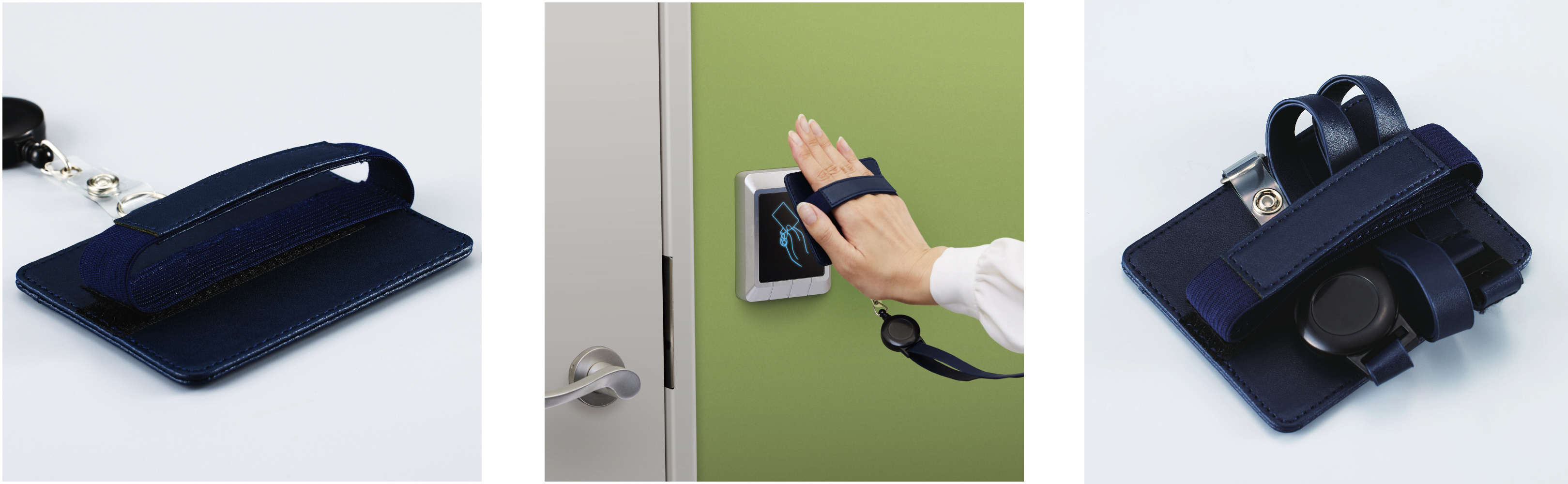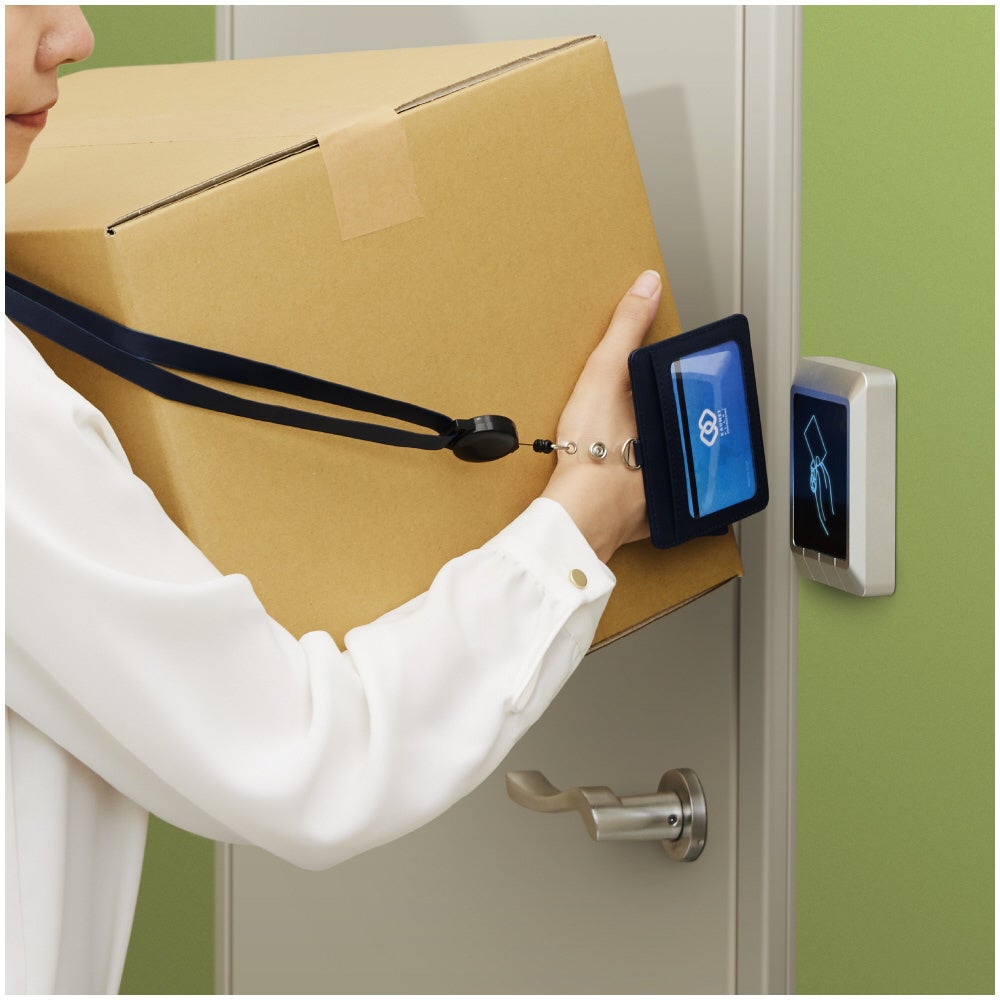 ワークショップテーマの一つであった「入室管理にまつわるいくつかの問題」においては、上肢障がいユーザーや車椅子ユーザーにおけるIDカードホルダーの「掴みにくさ」「かざしにくさ」や、健常者においても大きな荷物等で両手がふさがった状態での「保持しにくさ」などの課題が発見されました。この課題を解決すべく、IDカードホルダーに手を入れる・つかむ・引っかけるなどの多様な持ち方に対応するバンドを付けることで、入退室のカード操作をスムーズにするアイデアが検討され、今回の新商品開発に至りました。