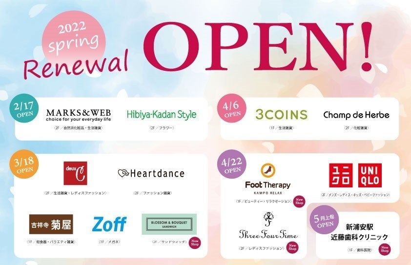 2022年4月に、「ユニクロ」「3COINS」「シャン・ド・エルブ」が約4か月の休業を経て、待望の増床オープンをいたします。その他、生活に彩を添える“今欲しい!”アイテムを取り扱うレディスファッションブランド「スリーフォータイム」、”足から身体を健康にする”をコンセプトにしたリラクゼーション「フットセラピー」、5月にはキッズルームを併設した歯科クリニック「新浦安駅 近藤歯科クリニック」がNEWオープンいたします。より近隣のお客様に寄り添った、便利で新しい発見のある施設に生まれ変わります。