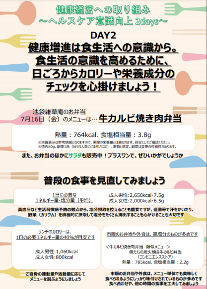 この考えのもと、健康保持・増進のための取り組みを通して社員が健康で安心して仕事を楽しめる居心地の良い環境をつくり、生産性2倍の実現を目指して下記活動をはじめとした健康経営に取り組んでいます。