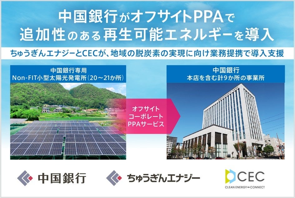 オフサイトPPAサービスの導入にあたり、株式会社ちゅうぎんフィナンシャルグループ(以下「ちゅうぎんFG」という)の株式会社ちゅうぎんエナジー(岡山県岡山市北区丸の内一丁目15番20号 ちゅうぎん本店ビル9階 代表取締役 松岡 信一、以下「ちゅうぎんエナジー」という)は、株式会社クリーンエナジーコネクト(東京都千代田区大手町2-2-1 代表取締役 内田 鉄平、以下「クリーンエナジーコネクト」という)と業務提携契約を締結して協業をおこない、地域の脱炭素の実現に向けた第1弾として、中国銀行向けにオフサイトPPAサービスを提供いたします。