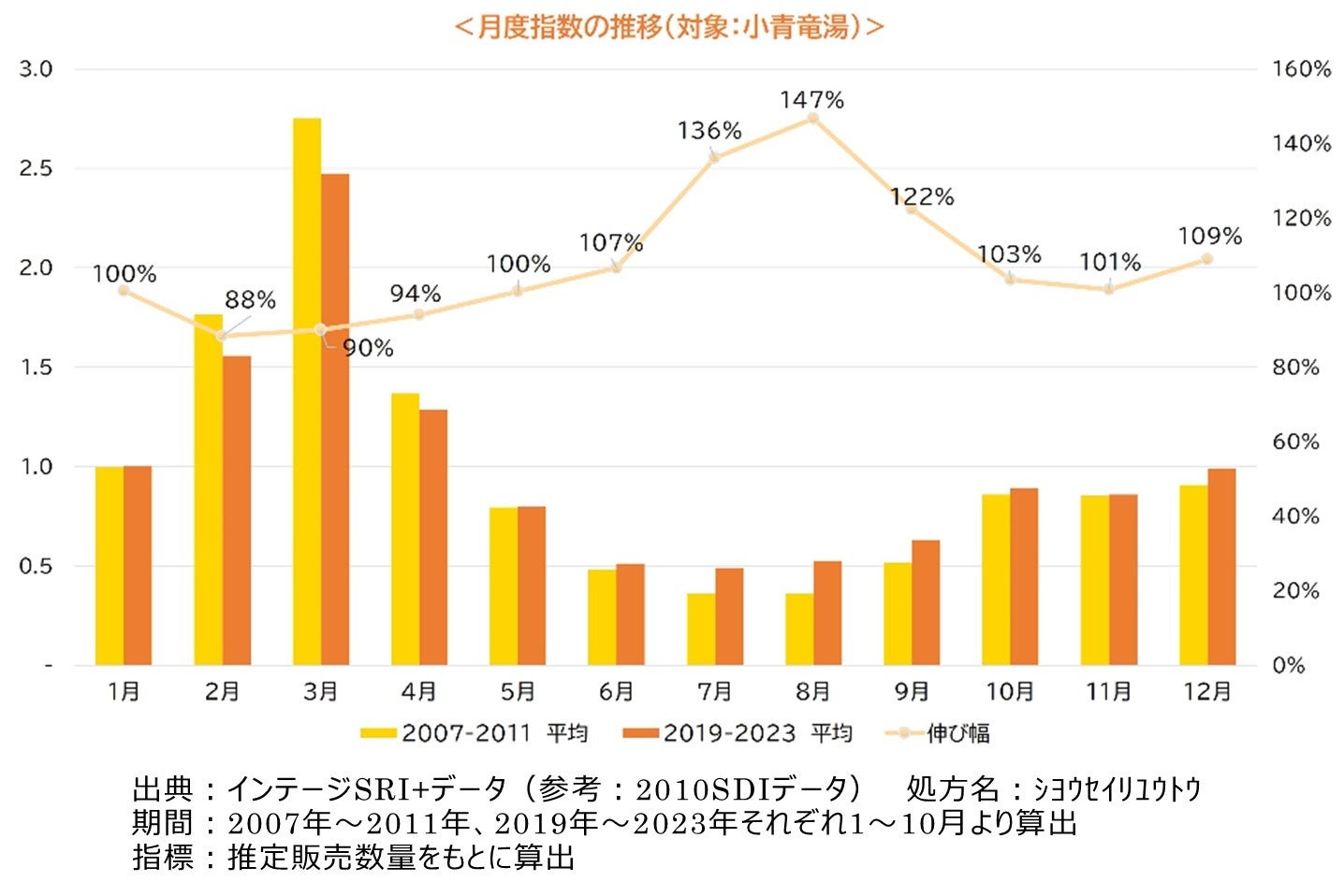 また、10年前の季節指数と比較すると、直近4年間においてはやや秋口にかけての伸長が見られます。一方、春先の指数はダウン傾向にあり、秋花粉(イネ・ブタクサ等)の広まりが需要増に影響していると考えられます。
