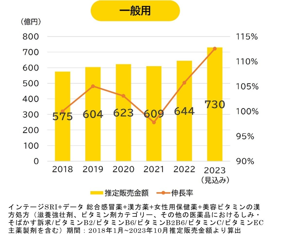 薬局やドラッグストアで販売される一般用漢方薬の市場規模は、直近6箇年では増加傾向にあり堅実な成長を見せています。2021年度はコロナ禍における漢方風邪薬の落ち込みにより減少傾向となりましたが、昨年から回復に転じ、今年は前年比113%を見込んでいます。