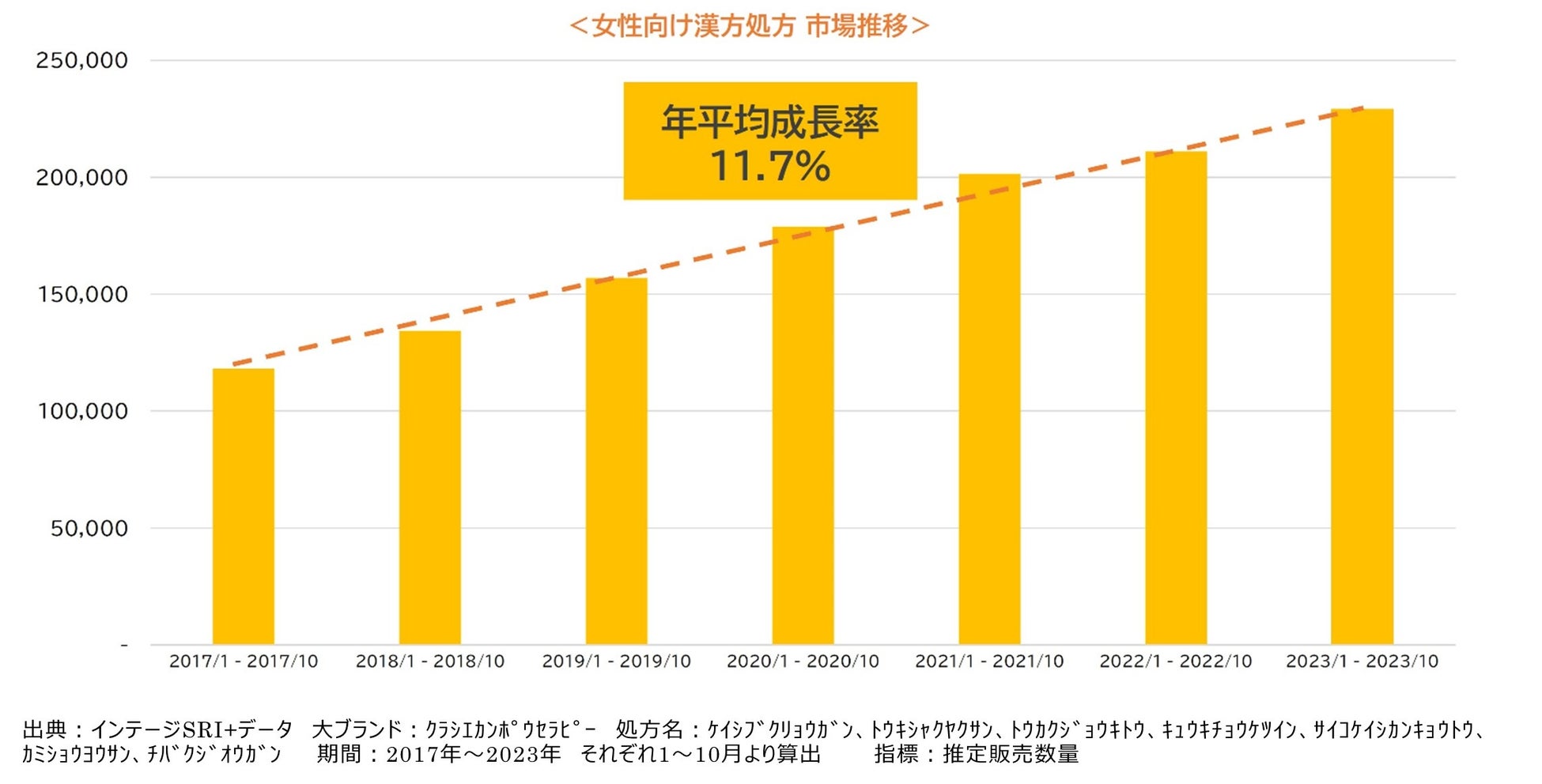 漢方薬はPMSや月経不順、更年期といった症状に対し、そのような病名が無かった時代から、女性特有の疾患効果があるとして用いられてきました。女性特有の多種多様な悩みと漢方薬の親和性は高く、実際にフェムテック・フェムケアという言葉が日本で広がり始めた2019年前後から、女性疾患処方の伸長が顕著に表れており、年平均11.7%の成長率で拡大しています。フェムケア関連市場の拡大とも相まって、漢方薬の視点からも非常に注目度の高いカテゴリーであると考えています。
