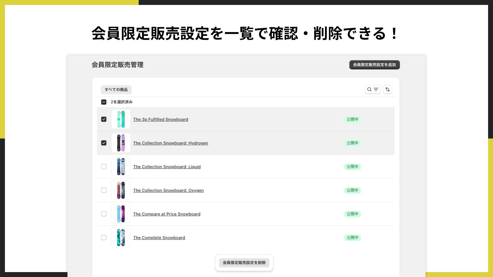 「シンプル会員限定販売|お手軽アカウント必須販売」は、「会員限定販売管理」ページで会員限定販売設定を一覧で確認・削除できます。これにより、ストア運営者は会員限定販売設定の状況を一目で確認できます。また、会員限定販売設定を一括で削除することができるため、商品を一つずつ削除する手間が不要です。