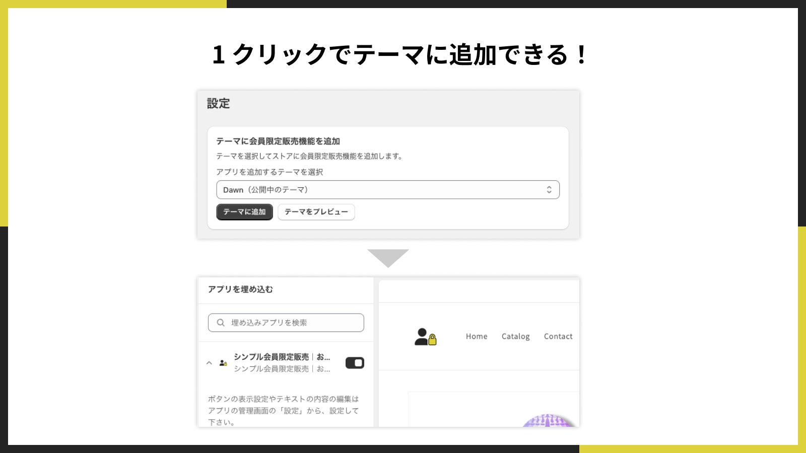 「シンプル会員限定販売|お手軽アカウント必須販売」は、テーマに会員限定販売機能を1クリックで追加できます。Shopify を始めたばかりの方でも簡単にご利用いただけます。