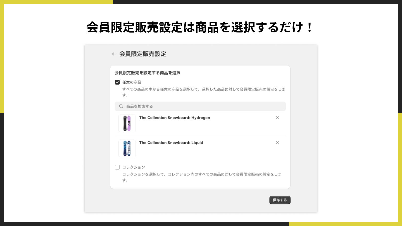 「シンプル会員限定販売|お手軽アカウント必須販売」は、商品を選択するだけで簡単に会員限定販売設定ができます。Shopify に始めたばかりに方でも安心してご利用いただけます。