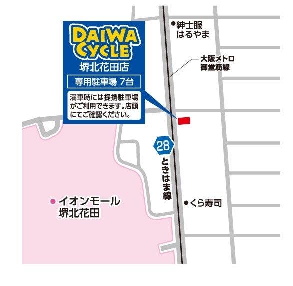 ダイワサイクル堺北花田店は、ときはま線(大阪府道28号)に面し、大阪メトロ北花田駅1番出口から北に徒歩約5分に位置します。イオンモール堺北花田もすぐ近く、通勤通学途中やお買い物途中に空気入れや、お困りごとなど、気軽にお立ち寄りいただきやすい立地です。