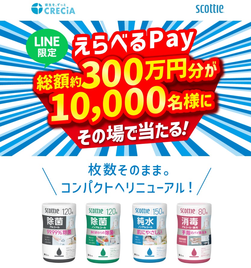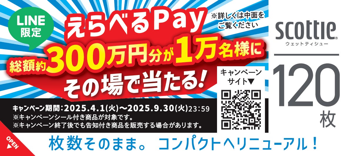 日本製紙グループの日本製紙クレシア株式会社〔住所:東京都千代田区神田駿河台4-6、代表取締役社長:安永敦美〕は、枚数はそのままでコンパクトボトルにリニューアルしたスコッティ ウェットティシューにおいて、2025年4月1日(火)から2025年9月30日(火)の期間、LINE限定「えらべるPay総額約300万円分が1万名様にその場で当たる!キャンペーン」を実施いたします。