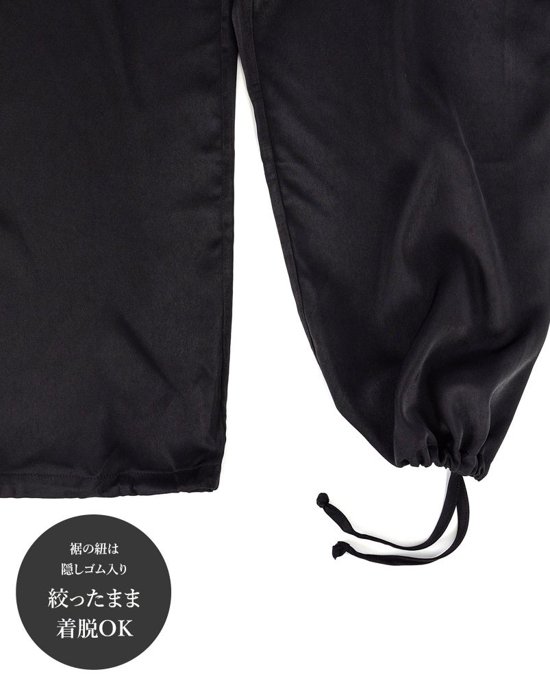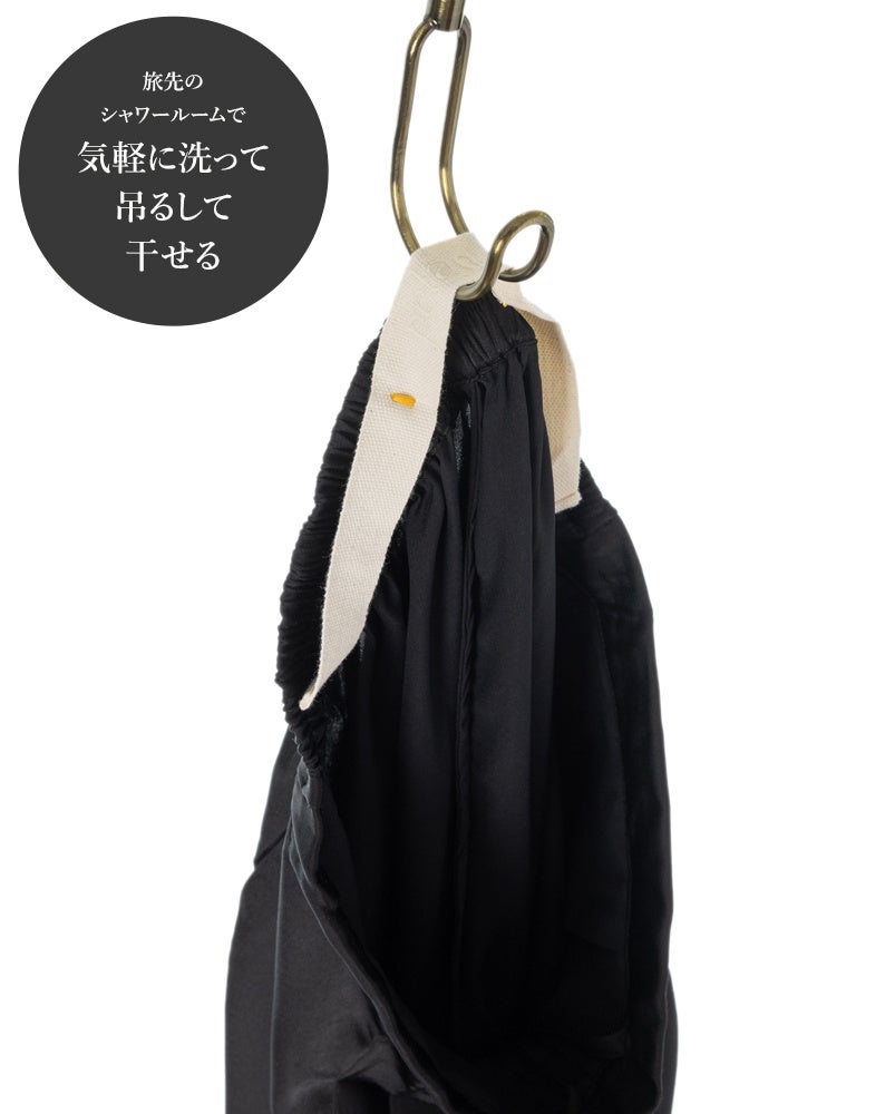 パンツの裾はドロスト(紐)の半分だけがゴムなので、ワイドにしたり絞って穿いたり、というスタイルの変化だけでなく、絞ったままの着脱ができるので、旅先のトイレで床にパンツが付いて汚れるのを気にすることもありません。