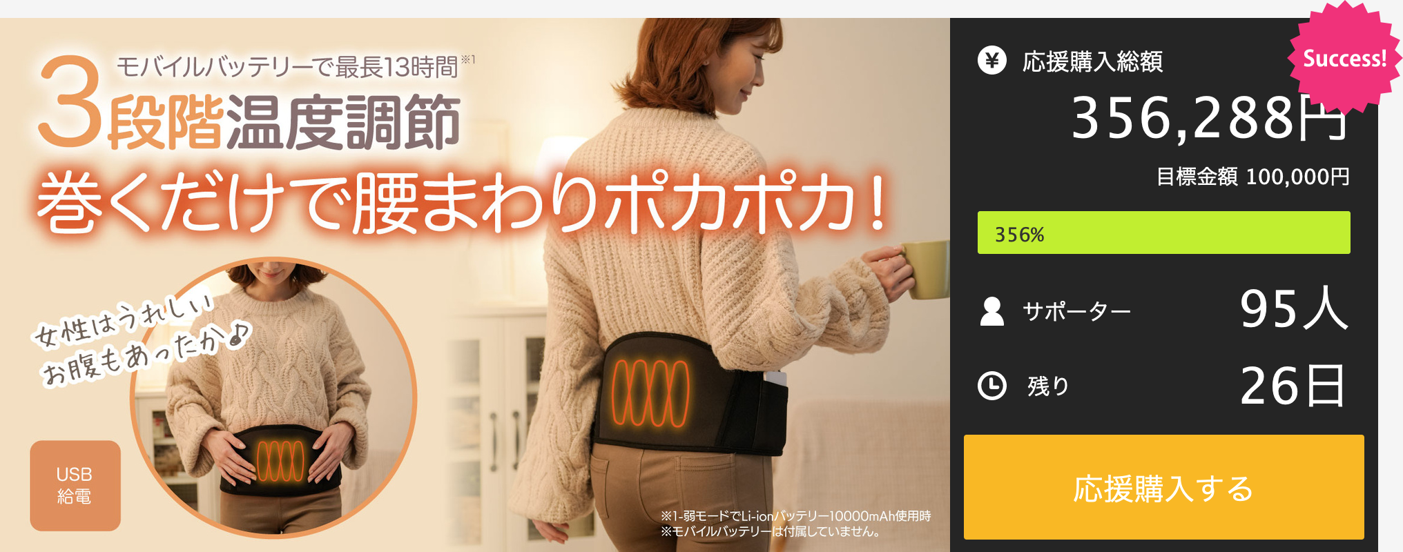「ヒーター内蔵あったか腰ベルト」Makuake(マクアケ)にて開始数時間で目標達成しました!スイッチONですぐにあったか!"おうちで温活"冷えやすい腰・お腹をサポート!