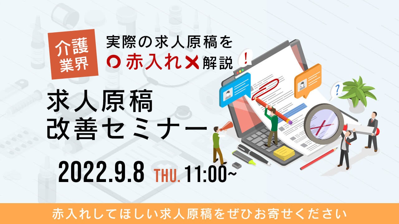 当セミナーでは、「介護」「ドライバー」の人材採用担当者向けに、求人原稿の改善について解説します。特に事前申し込みがあった求人原稿を赤入れし、より採用力のある表現にブラッシュアップし、実践的な原稿改善の方法のポイントをお伝えします。