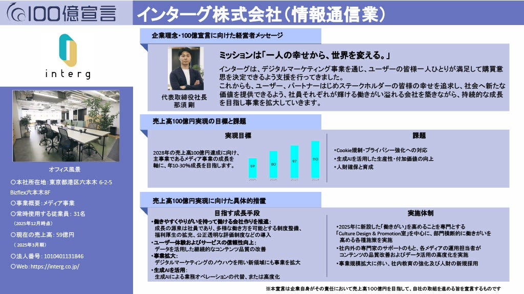 デジタルメディアの運営などを手掛けるインターグ株式会社(本社:東京都港区、代表取締役社長:那須 剛、以下、インターグ)は、中小企業庁および独立行政法人中小企業基盤整備機構が推進する、売上高100億円を目指す企業を支援するプロジェクト「100億企業宣言」へ参加しました。