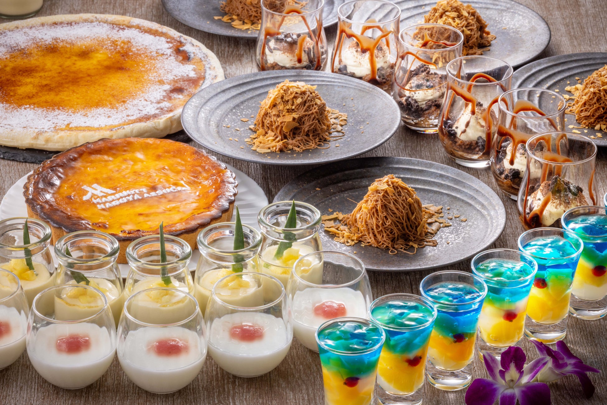 台湾カステラにタピオカミルクティー、杏仁豆腐、マンゴーとパッションフルーツのベイクドチーズケーキ、ココナッツプリン、バナナ風味のデザートピザなどが並び、細さ1mmのクリームを目の前でしぼるパーゴラ名物しぼりたてモンブランは、エスプレッソとマロンクリームが初登場。