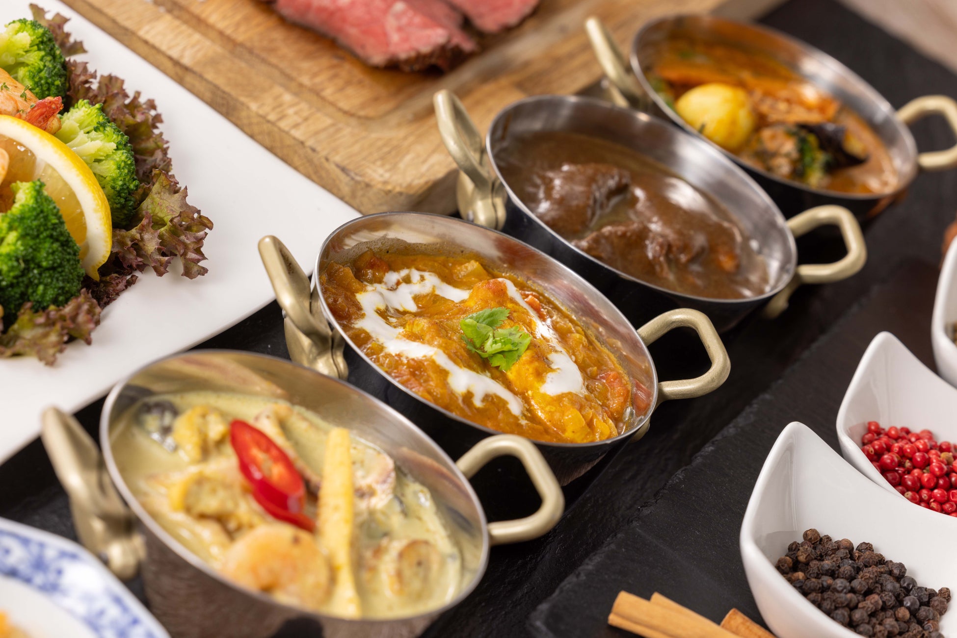 通常1種類のカレーコーナーには、4種のカレー。ココナッツ香るシーフードグリーンカレー、イギリスの国民食とも言われるチキンティッカマサラ、隠し味の味噌が決め手欧風ビーフカレー、野菜ごろごろベジタブルスープカレー。