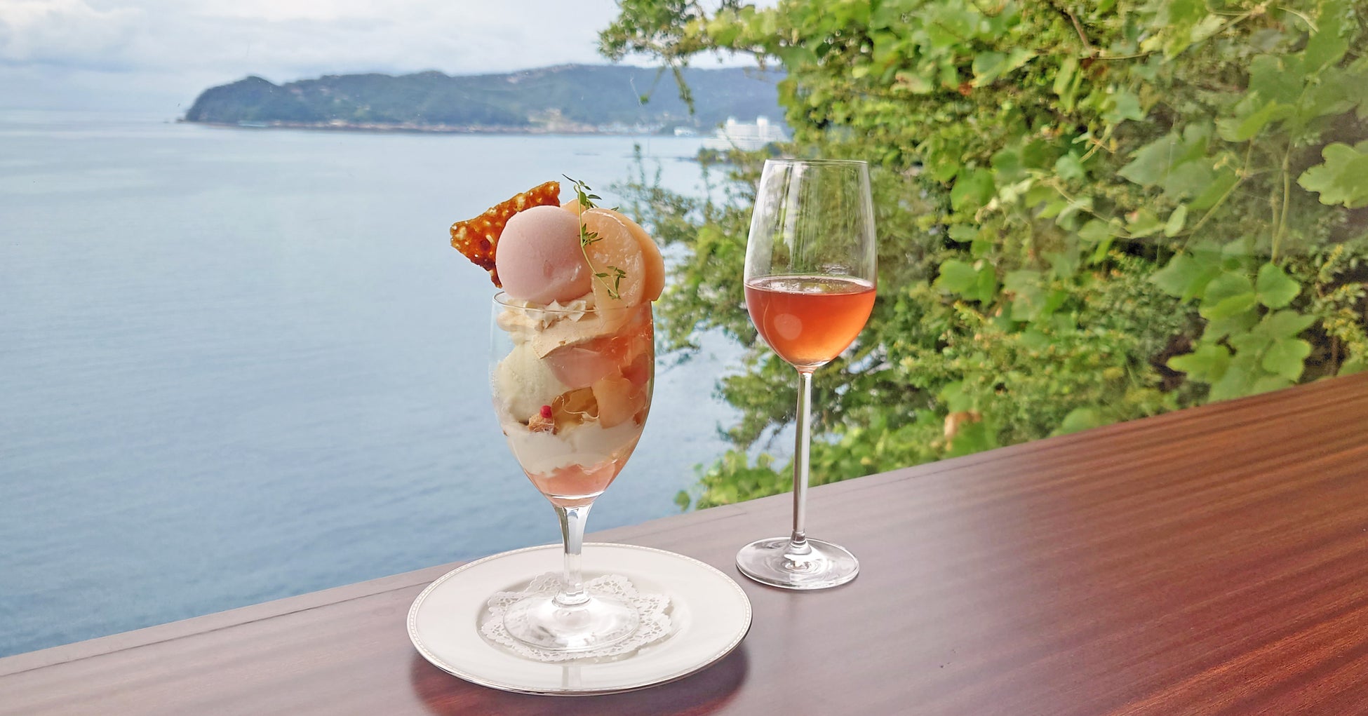 ペアリングドリンクは、南フランスのロゼワインをイメージしたノンアルコールカクテルです。黄金桂の烏龍茶をベースに、果実と相性のよいローズヒップ、ハイビスカスを抽出し、ほのかな酸味と花のような香りが桃のパフェと調和します。また、少量の岩塩で後味にほんのりと塩味を残し、南フランス地中海の潮の香りを思わせるドライな口当たりに仕上げました。目の前に広がる雄大な景色とともに、ふたつのマリアージュをお楽しみください。