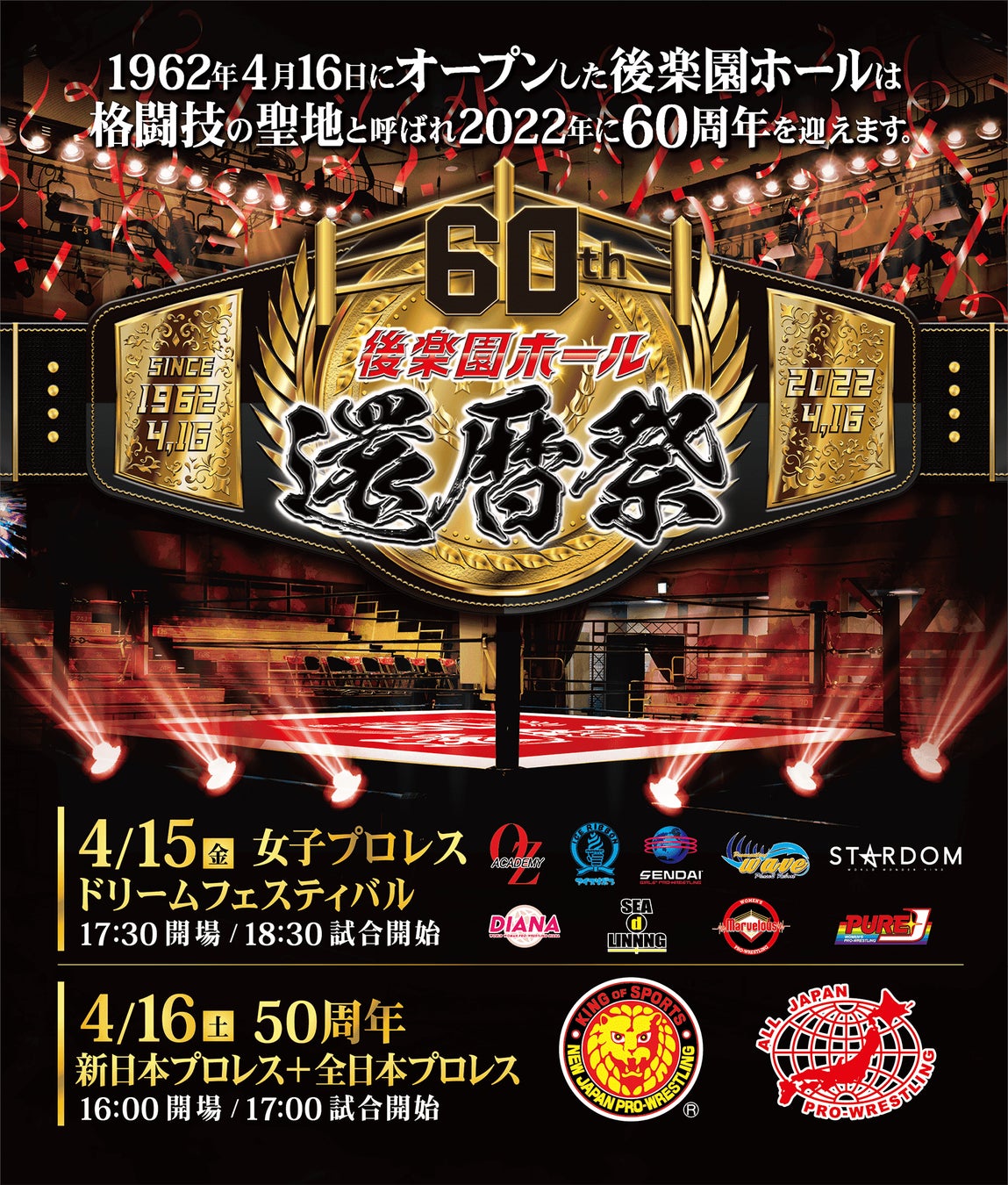 プロレスをはじめ、ボクシングやキックボクシングなど、後楽園ホールはさまざまな興行で使用され、いつしか格闘技の“聖地”と呼ばれるようになり、また数々の名勝負も繰り広げられてきました。そして、すでにお知らせしております通り、お客様・団体チーム・挑戦し続ける選手へ感謝を込めて、東京ドームが初主催となるプロレス大会「後楽園ホール 60周年 還暦祭」を4月15日(金)・16日(土)に開催します。このたび、注目の全対戦カードの詳細が解禁されましたのでお知らせします。