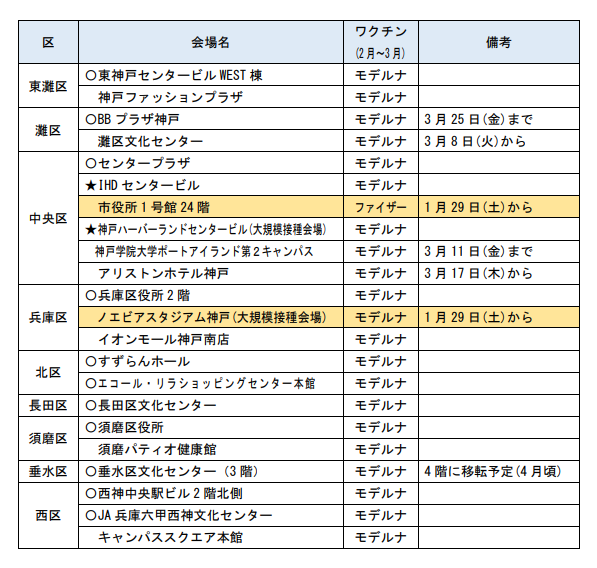 ・「市役所1号館24階会場」「ノエビアスタジアム神戸会場」以外の会場は、原則、2月5日から追加接種を始めます。