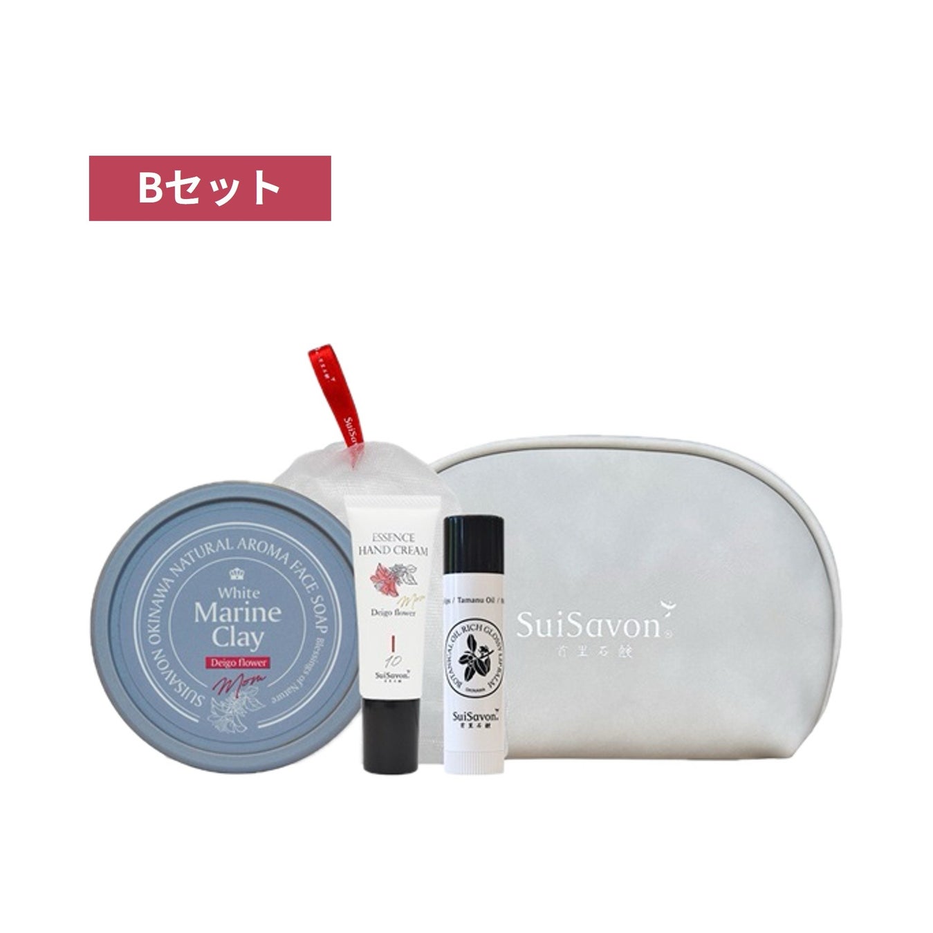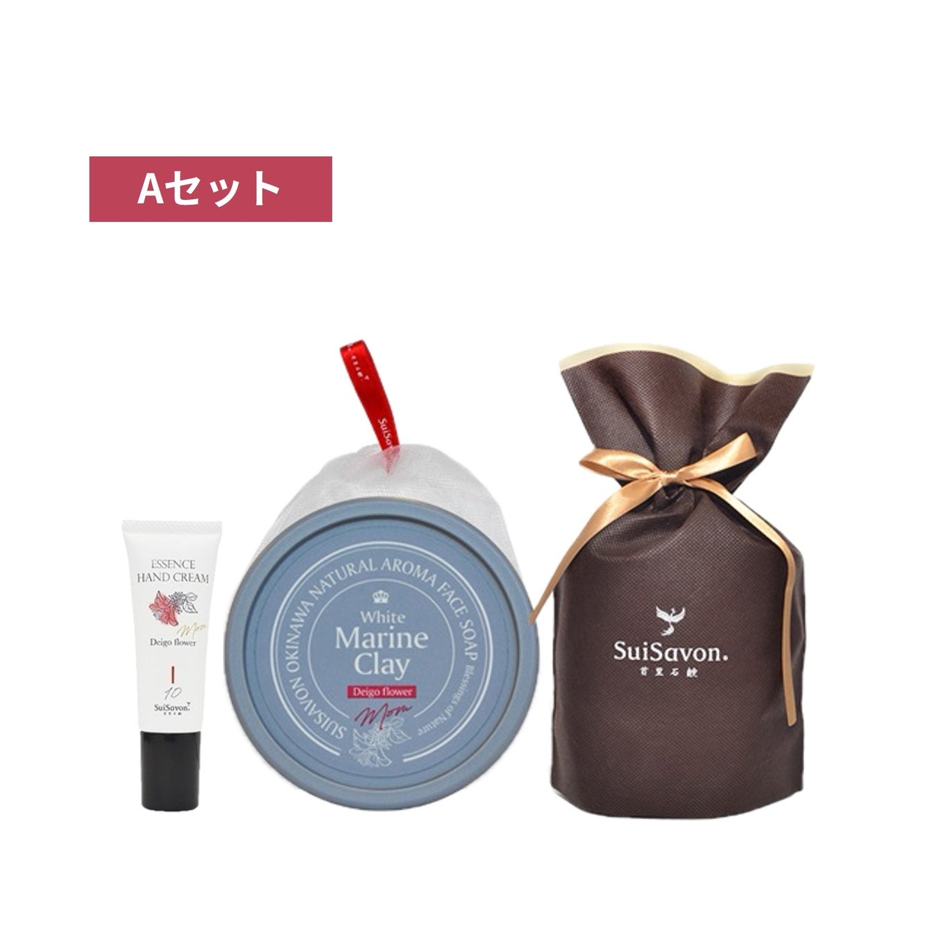 “ひとりでも多くの方が、お母さんへ感謝の気持ちを伝えられますように。”という願いを込めて、母の日特別セットを4種類ご用意しました。首里石鹸店主が母親を想い誕生した「ホワイトマリンクレイ洗顔石鹸 MOMでいごの花の香り」や「エッセンスハンドクリーム MOMでいごの花の香り」をはじめ、ご好評いただいている「バウンスジェリー」や各種クレンジングなど、感謝の気持ちに寄り添う母の日特別セットとなっています。また今年もB~Cセットは、首里石鹸オリジナルラウンドポーチ※1をお一つお選びいただけます。