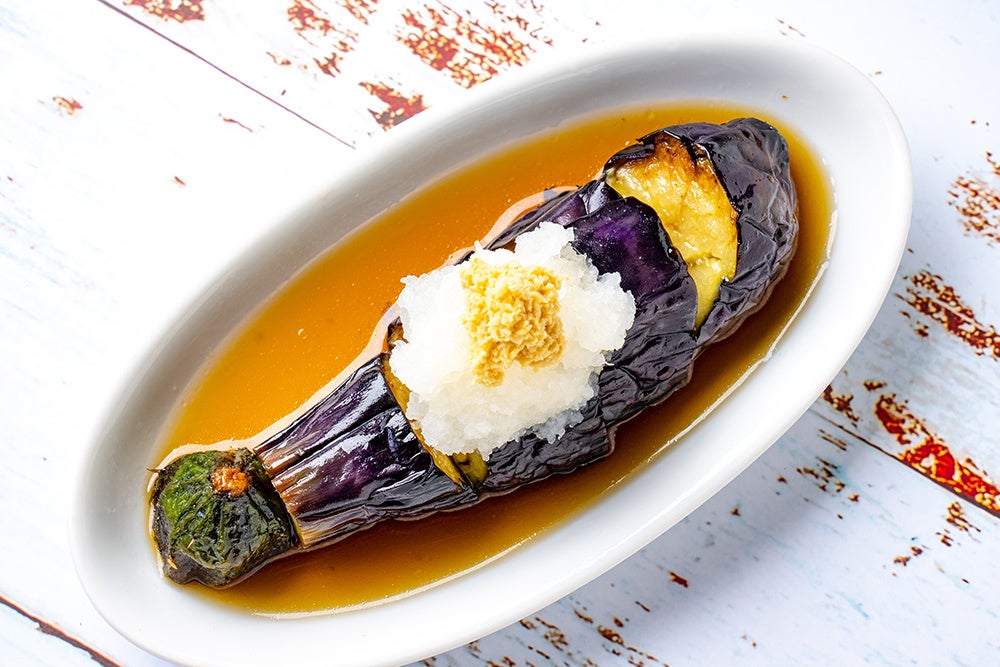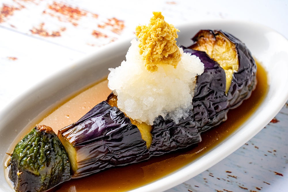 出汁が染み込んだとろとろ茄子の旨みを大根おろしと生姜でさっぱりと楽しむ一品