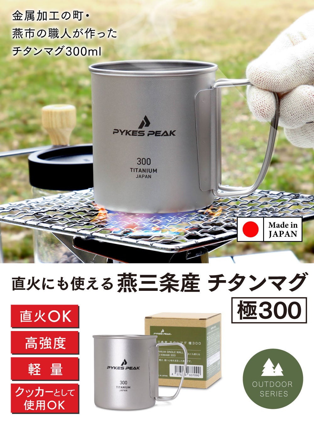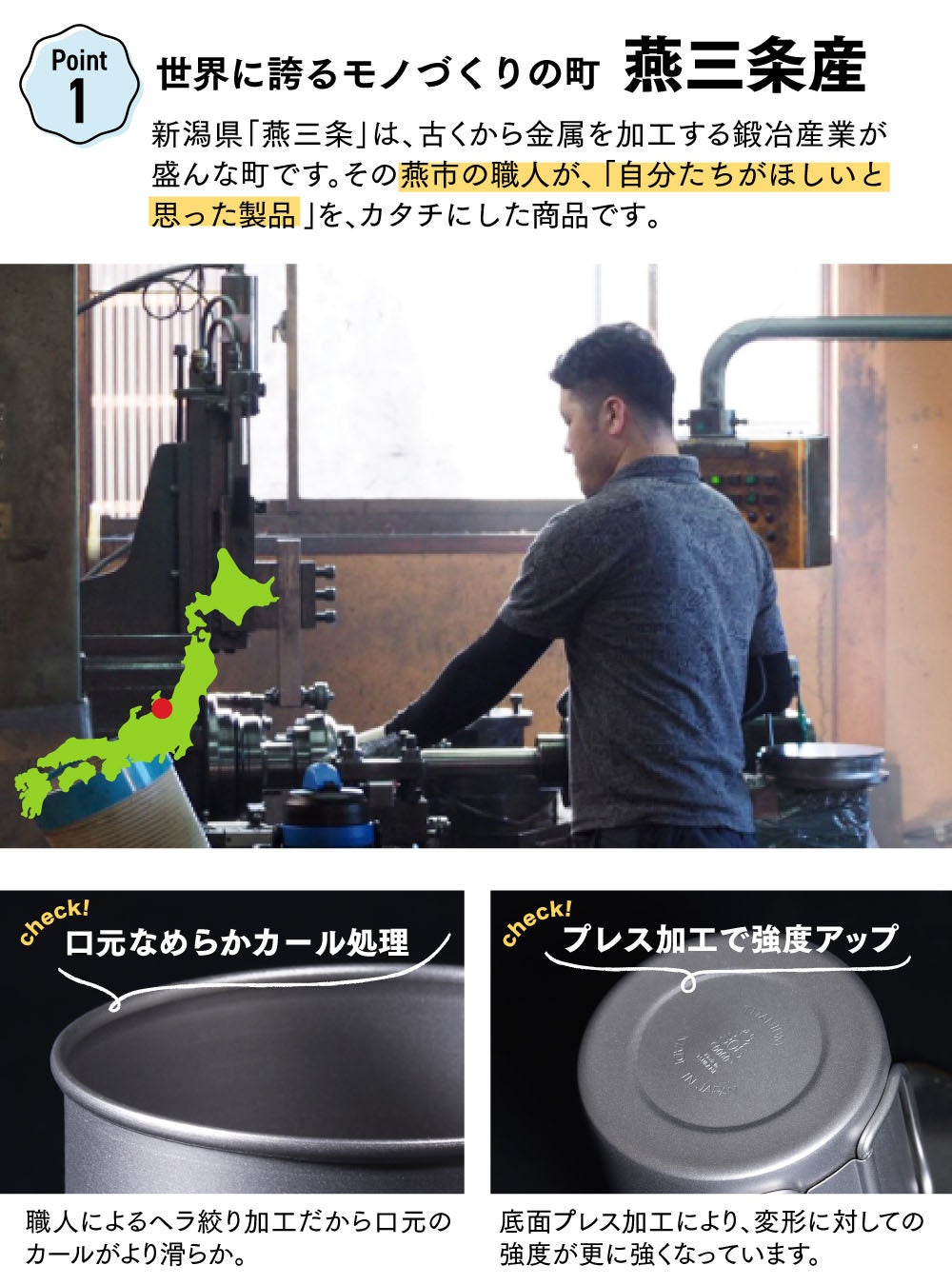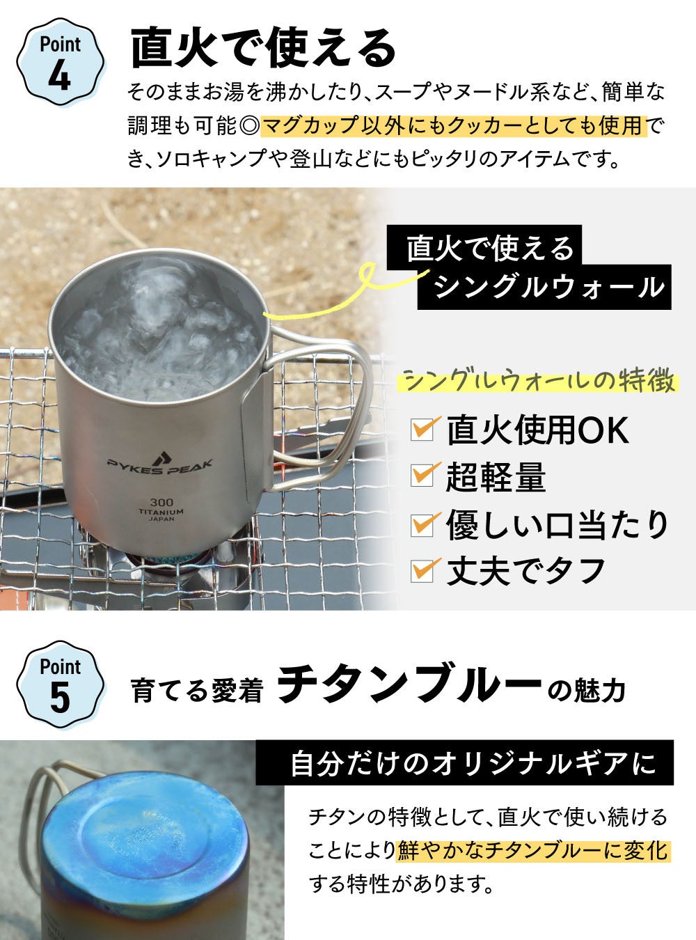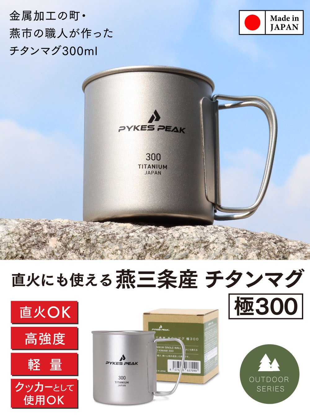 【高品質の燕三条日本製チタンマグ!】キャンプでも多く利用されているチタンマグは、「強度・軽さ・錆びに強い」というチタンの性質から、キャンプなどのアウトドアシーンで大活躍してくれる人気アイテムのひとつです!品質のいい日本製にこだわり、新潟県の金属加工の街「燕市の燕三条」を使用した高級感・質感ともにおすすめなPYKES PEAK ( パイクスピーク ) ブランドのチタンマグです!焚き火などでの直火での使用も想定して設計されております。