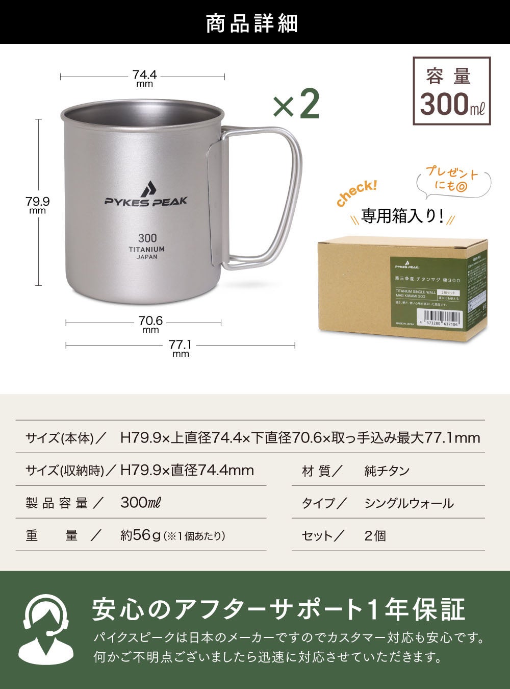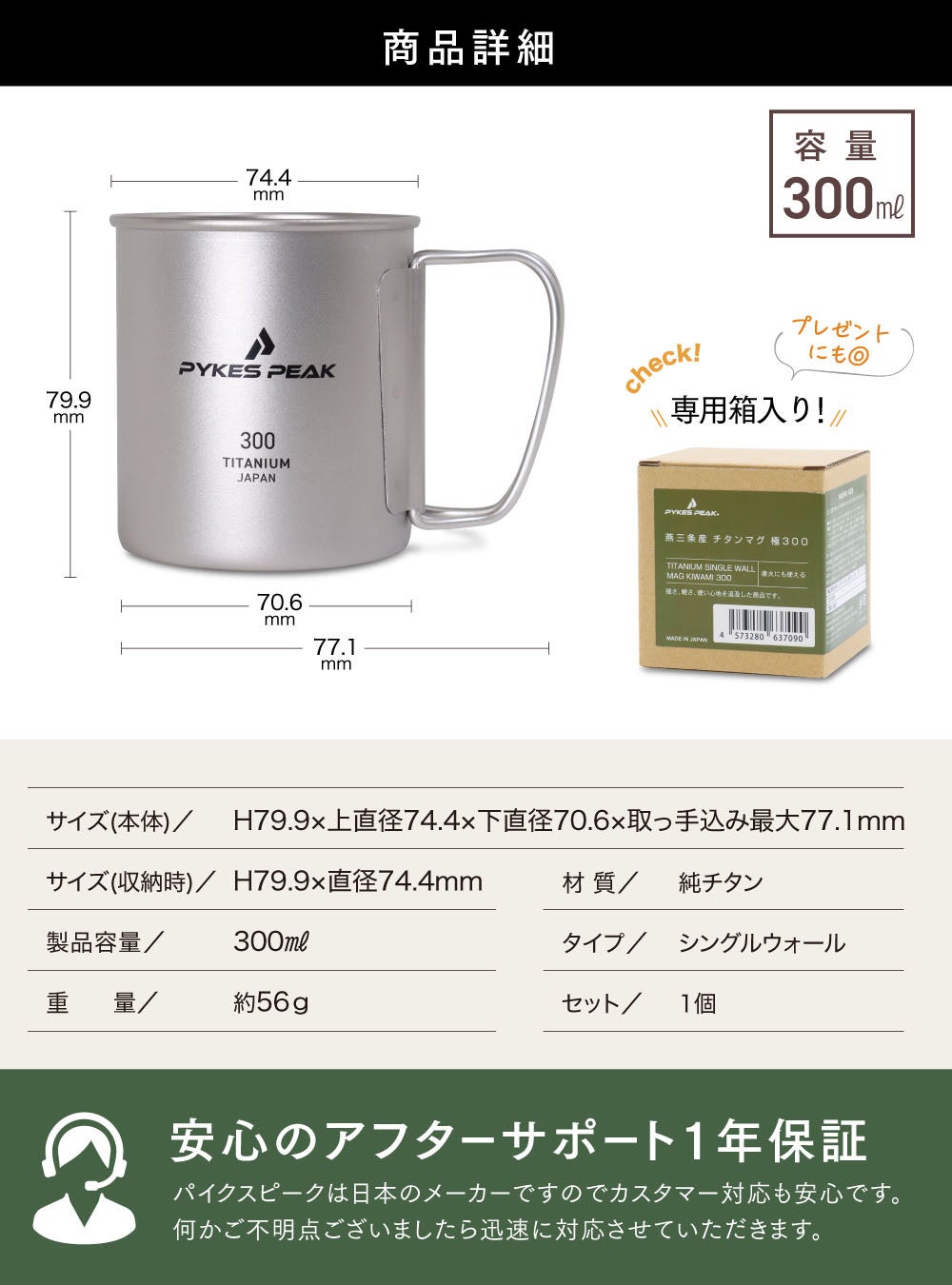 PYKES PEAKチタンマグは、燕三条の職人の加工技術により、使う人のことを第1に考えて設計されております。「ヘラ絞り加工」という技法により、チタンマグの飲み口のカールを滑らかにし、口当たりの良さを実感していただけます!チタンマグ底面に燕三条産の公式マーク入り!取っ手も側面に収納できる高さ79.9mm×直径74.4mm(取っ手収納時)で、コッヘルやクッカー等に収納してコンパクトに持ち運ぶこともできます。軽さ・コンパクトさはそのままに300ml容量を注ぐことが可能です。