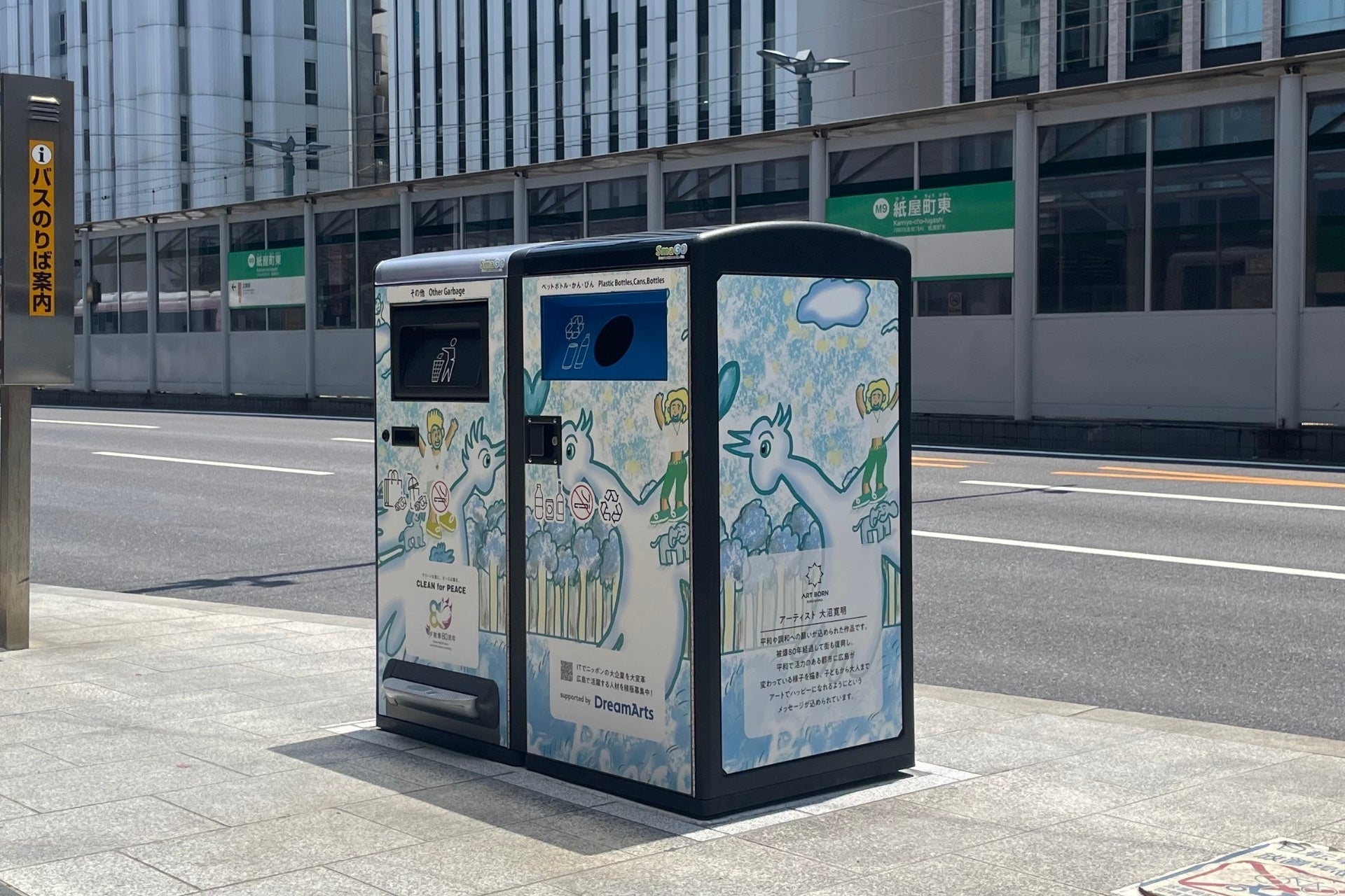 さらに、広島のアートプロジェクト「ART BORN HIROSHIMA」所属アーティストによる平和への願いを込めたアートのラッピングにより、ゴミを捨てる日常の行為を通じて、市民や来訪者に「平和への思い」を発信します。