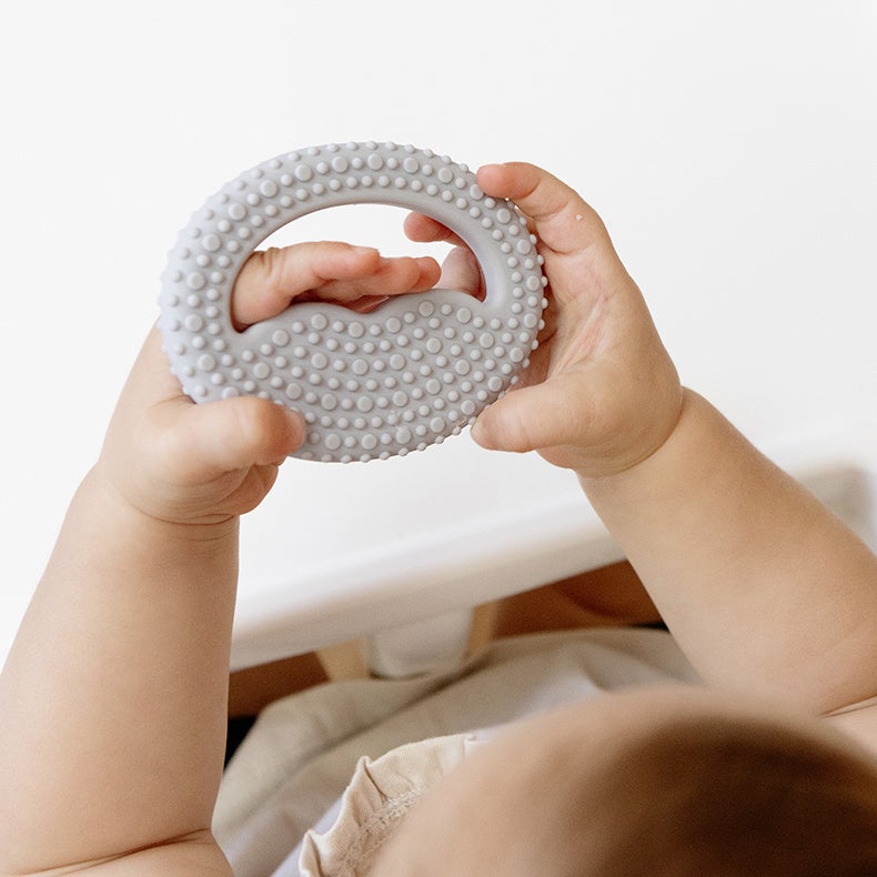 表面のポコポコとした突起は、乳歯が生え始める前の柔らかい歯茎を傷めることなく、乳歯が適正なタイミングで生えるように優しく刺激をします。