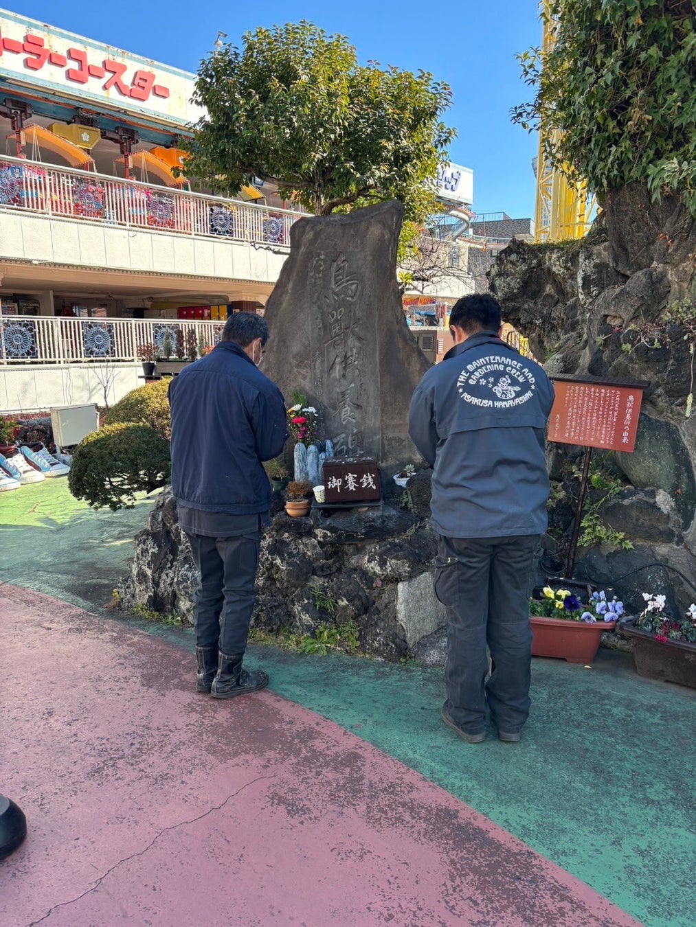 しかし、大正12年に起きた関東大震災で多くの動物たちが焼死しました。その後花やしきは避難所になりました。生き延びた動物たちもいましたが、余震時の逃走を防ぐため、薬殺をしなければなりませんでした。昭和5年にはその動物たちを供養するため、『鳥獣供養碑』が建設されました。現在も「ちびっ子タクシー」前の供養碑に花を手向けています。