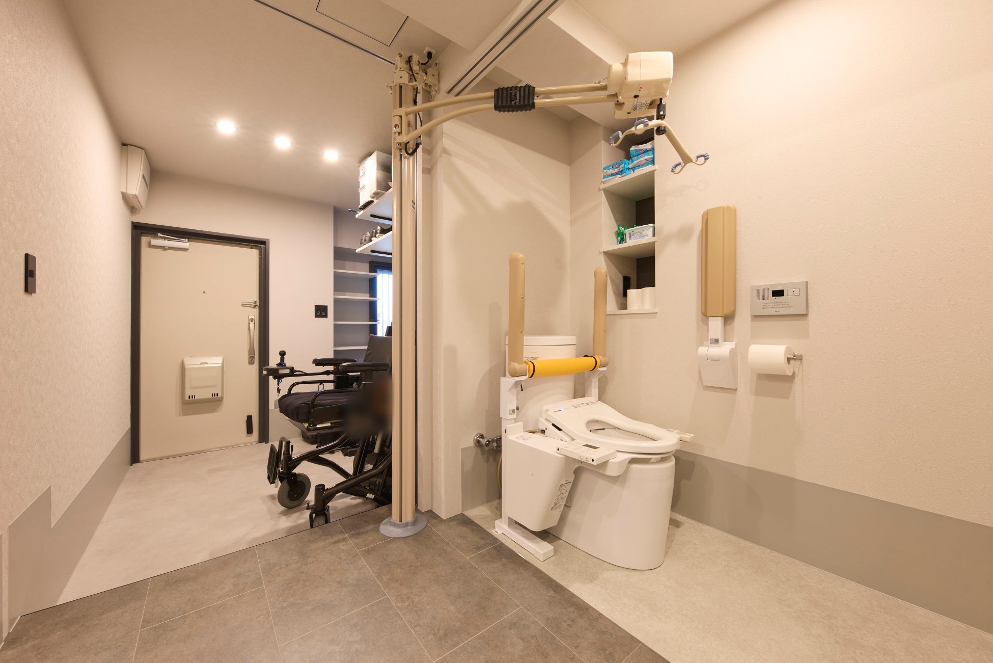玄関や居室には、車いすの乗り換えやベッドの移乗などで使用するリフトを設置。パラマウントベッドや介助サポートの知見も取り入れ、施主様による試乗など何度も検討を重ねて選定しています。