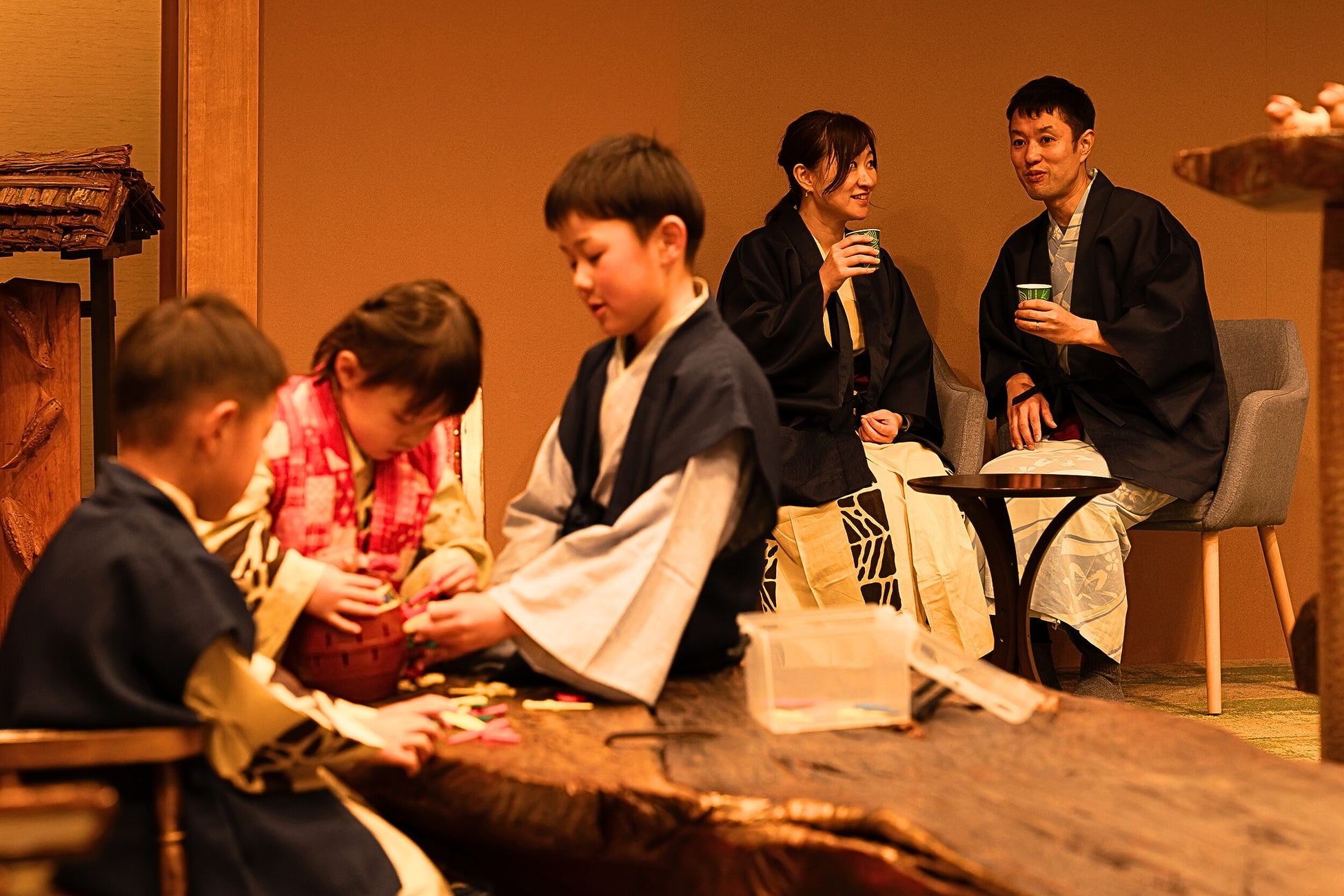 ロビーに新設したキッズスペースは「ご宿泊のお子様方が外国のお子様たちと遊びながら、初めての国際交流」することをテーマにしています。日本の伝統玩具や、言語知育など、日本文化に触れながら、英語やその他外国語にも親しめる環境を整えております。