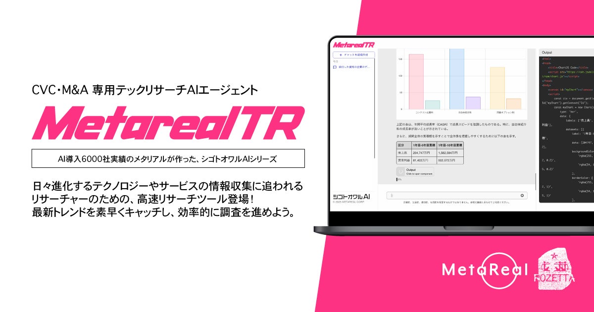 業種特化の専門AI開発・運営を行う株式会社メタリアル(本社:東京都千代田区、代表取締役:五石順一)は、協業先発掘や出資検討業務を支援するサービスとして、CVC・M&A領域専用AI「Metarealテクノロジーリサーチ(以下、Metareal TR」を4月23日(水)に新開発・提供開始したことを発表します。