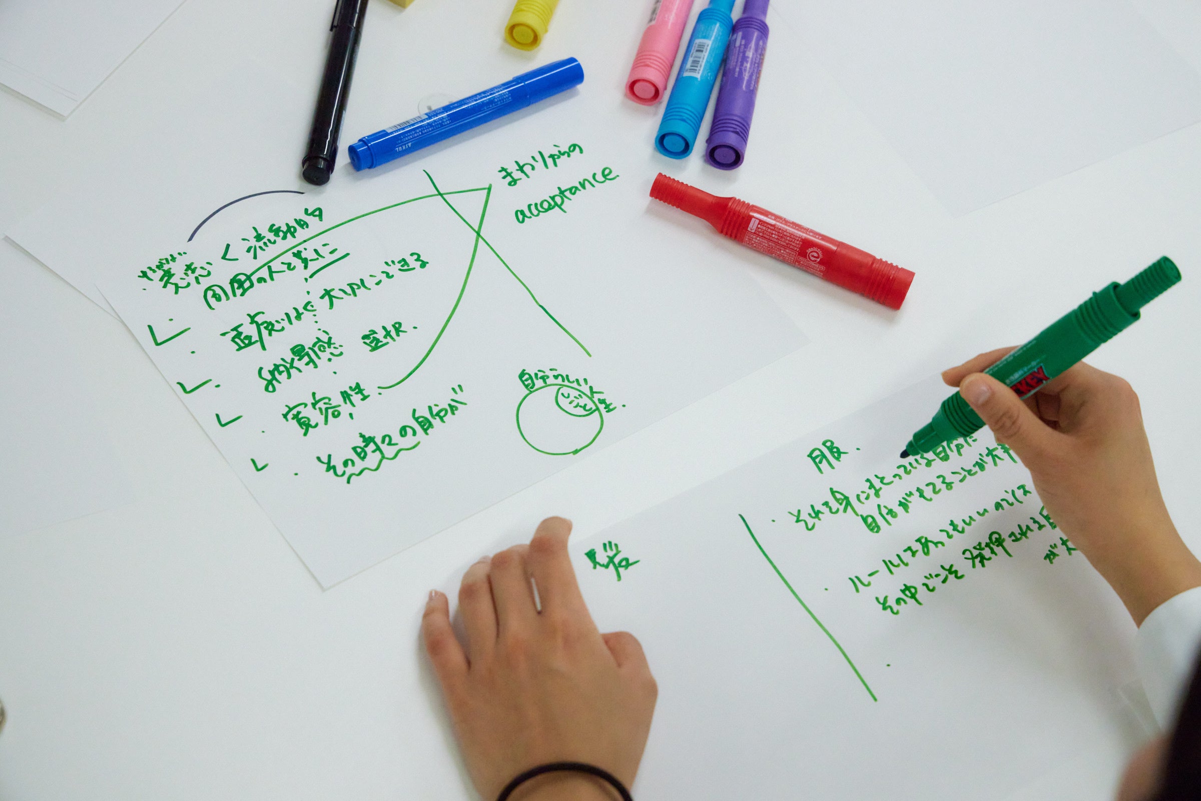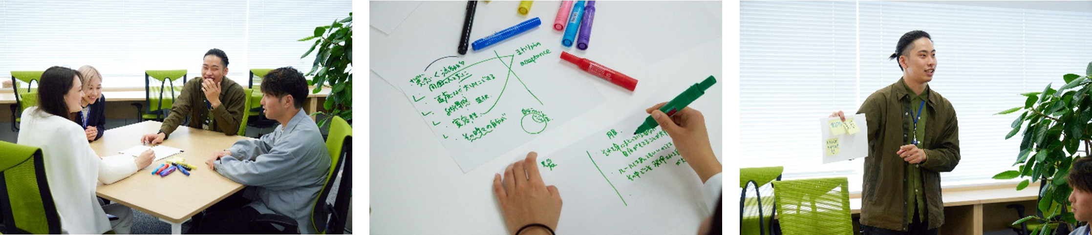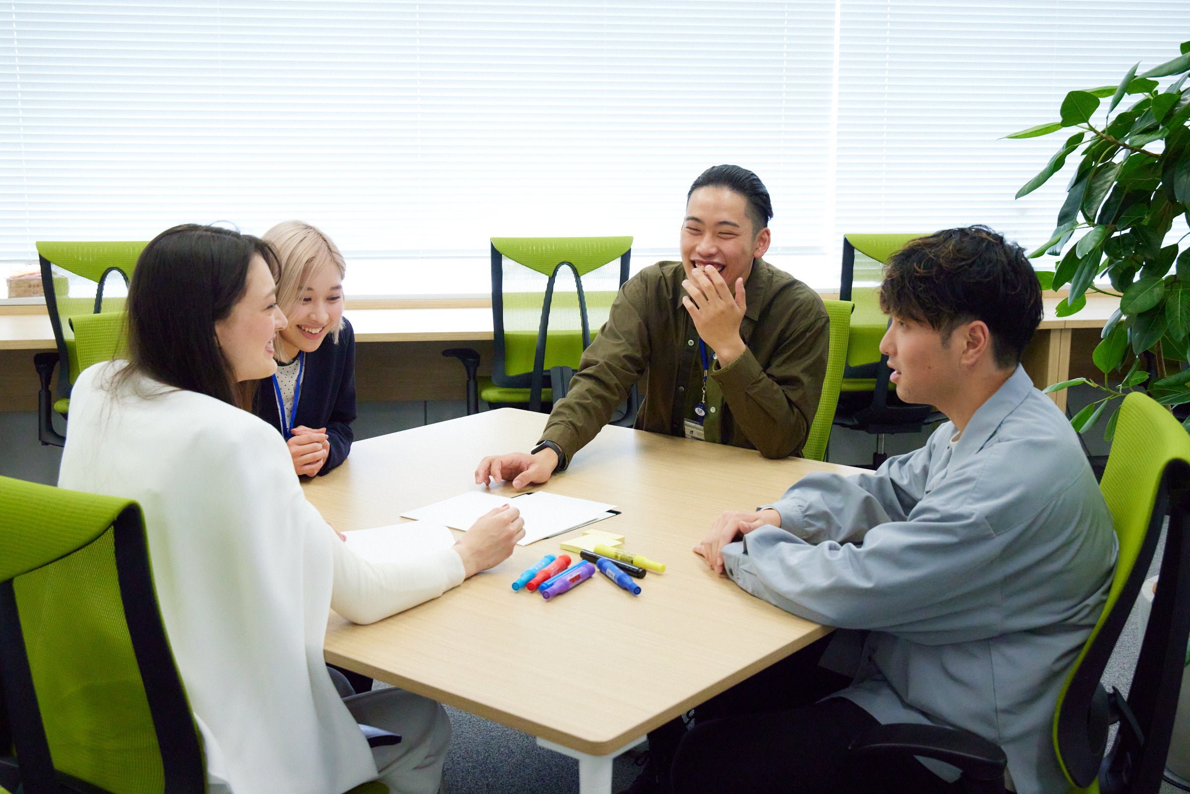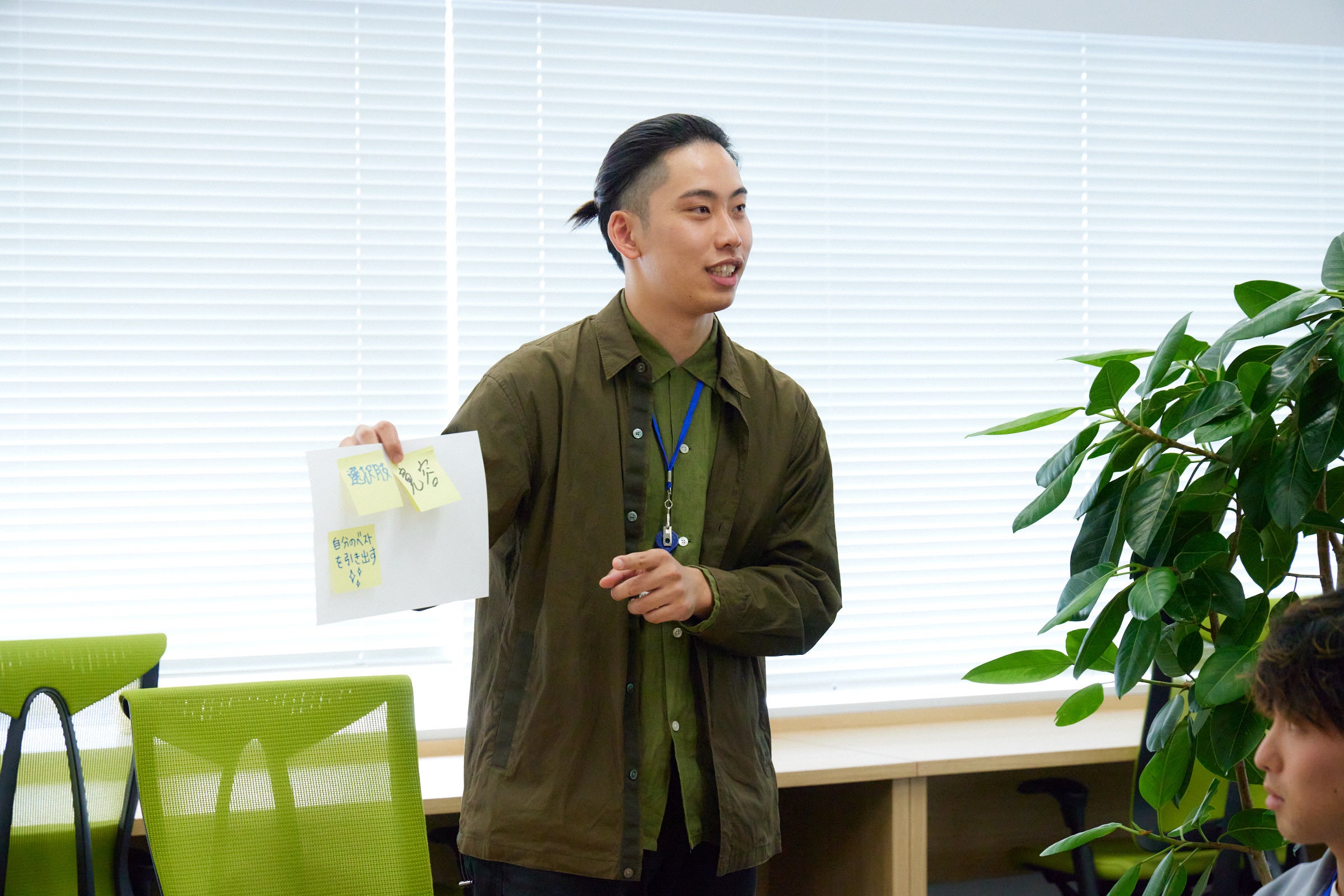 人事部からの挨拶の後、新入社員はグループに分かれてワークショップを行いました。このワークショップでは、カードに書かれた題材について、自分の価値観をもとに意見を述べ合います。『髪型・髪色・服装』というカードでは、「個人の寛容さが大切だと思います。社会全体を変えるにはまず、個人の考え方を変えることだと思います。」や「ルールやドレスコードがあることは決して悪ではなく、その中で自分の敬意を表せればよいと思います。ただ、現在はステレオタイプが一つしかないから、いろんな形のリスペクトがあってもいいと考えています。」という意見が交わされ、それぞれが持つ価値観の違いを実感していました。