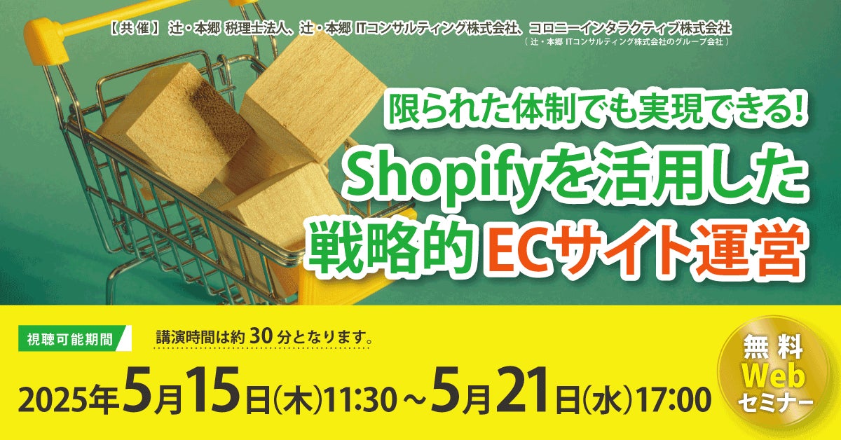 辻・本郷 税理士法人(本社:東京都新宿区、理事長:桑木小恵子)と、コロニーインタラクティブ株式会社(本社:大分県大分市、代表取締役:田上知之)と共催で、2025年5月15日(木)より「限られた体制でも実現できる! Shopifyを活用した戦略的ECサイト運営」セミナーを開催いたします。