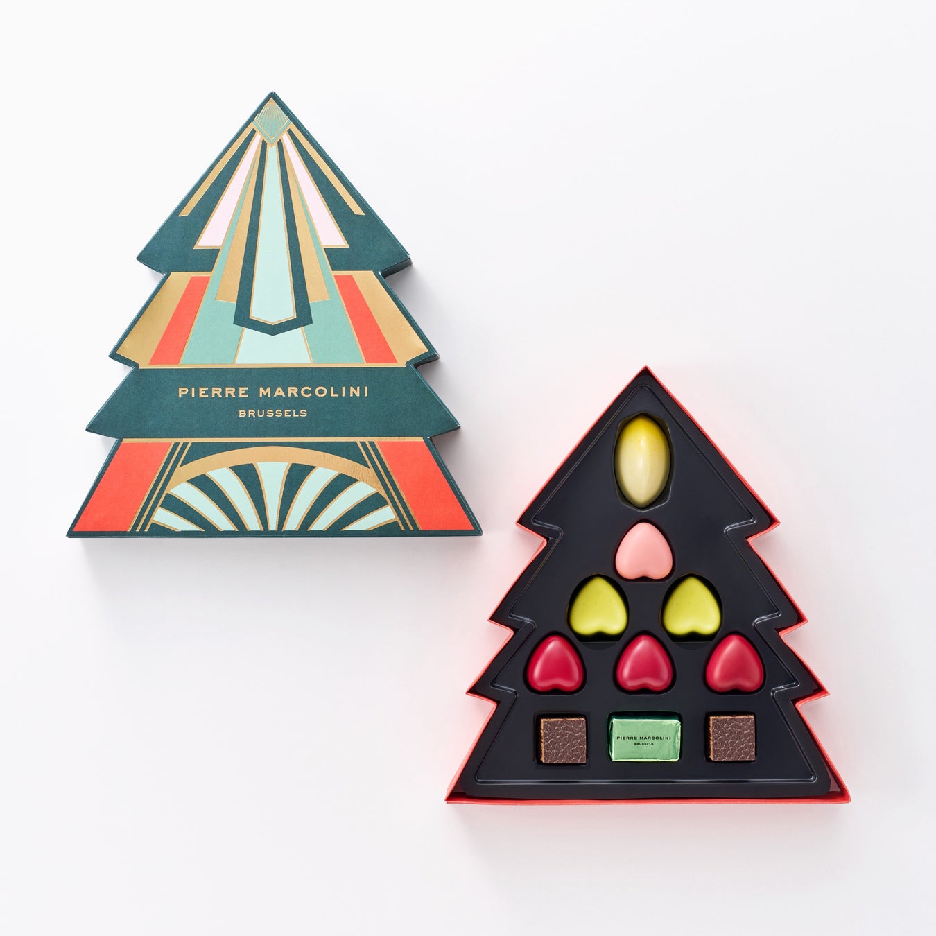ピエール マルコリーニの⼈気チョコレートをクリスマスツリーを象ったパッケージに詰め合わせました。