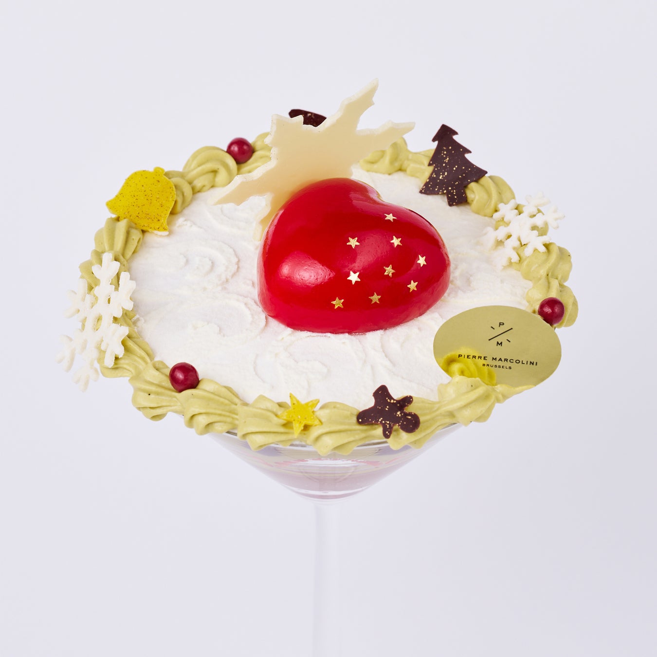 カカオの風味豊かなチョコレートアイスと、シチリア産ピスタチオを贅沢に使用したピスタチオアイス、フレッシュな苺、クロッカンフランボワーズを重ねたクリスマスシーズン限定のパフェです。トップに輝くハート型のフランボワーズ ムース、雪の結晶やクリスマスのオーナメントが華やかさを添えています。フランボワーズと苺のソースを掛けて、フレッシュな味わいをお楽しみください。